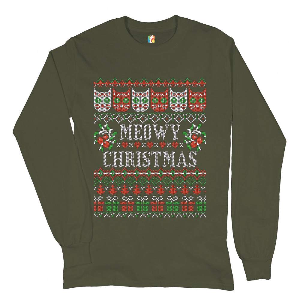MEOWY CHRISTMAS long sleeve t-shirt ugly sweater cat lover funny xmas military green