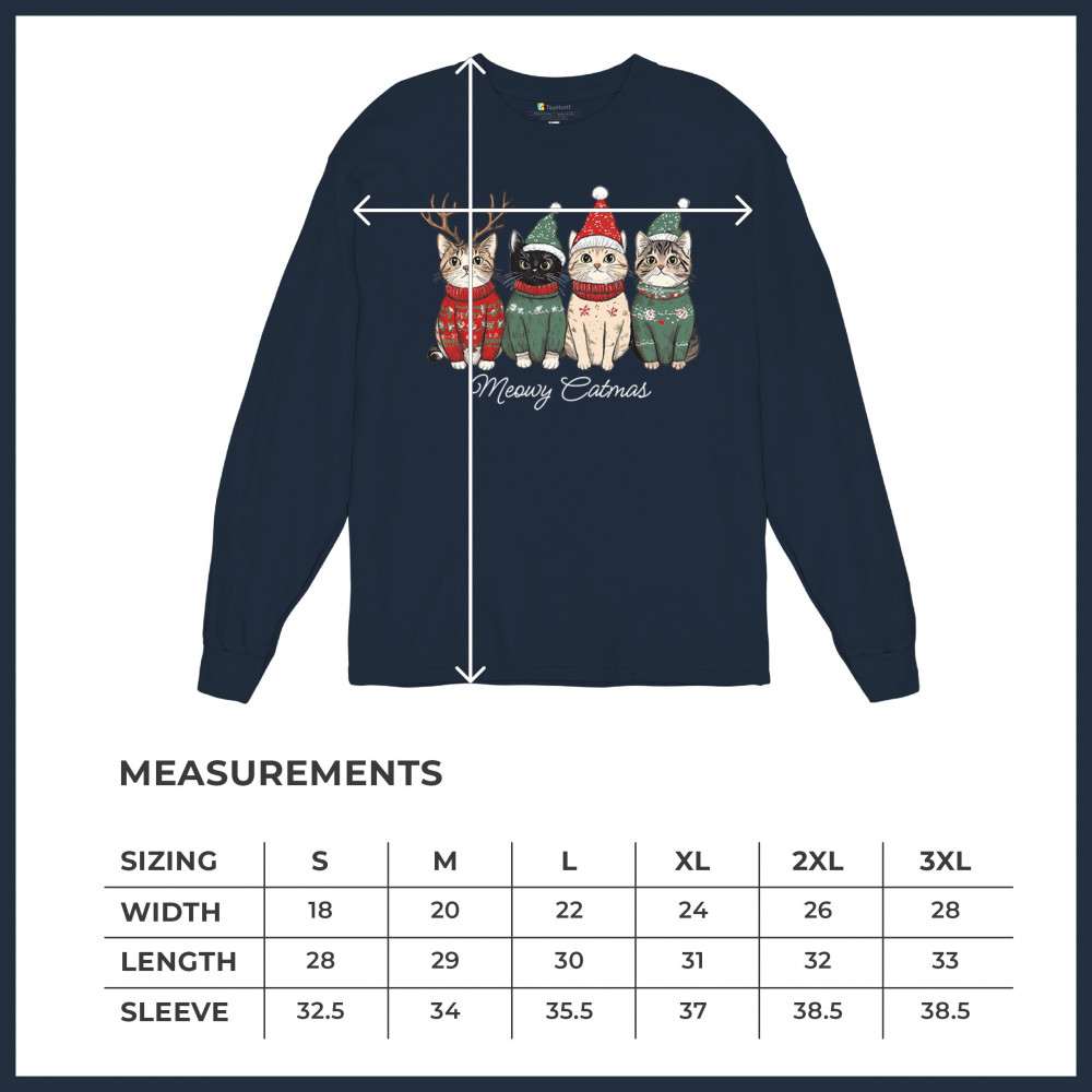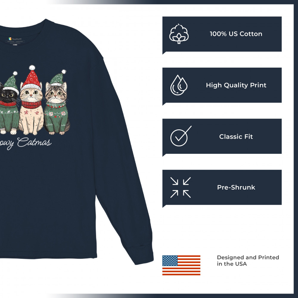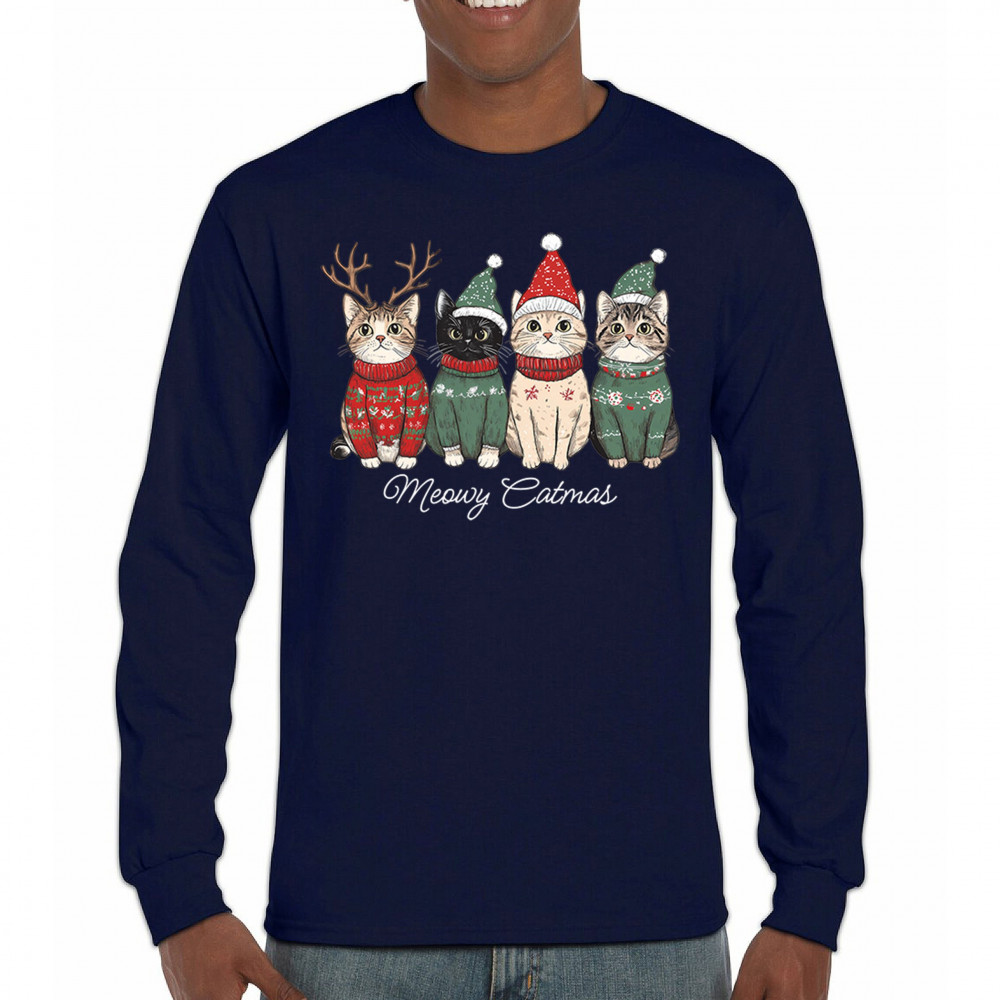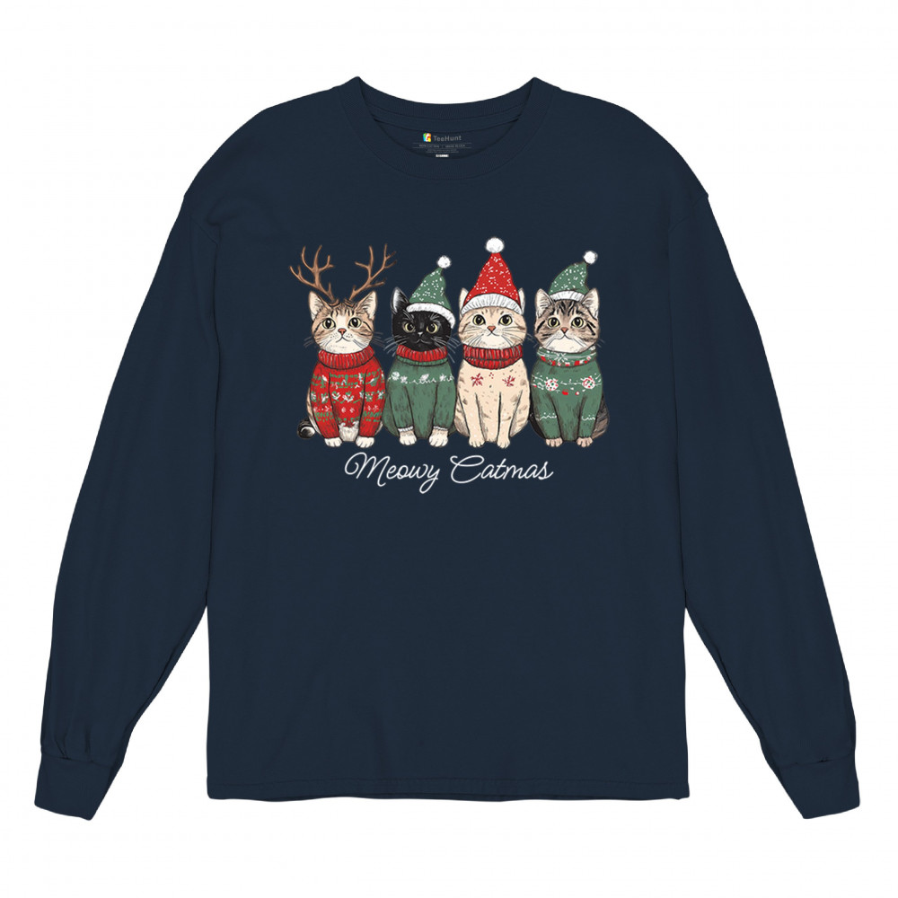 Cute Meowy Catmas design with festive kittens, perfect for cat lovers wanting a cozy holiday graphic and fun Christmas pet theme.
