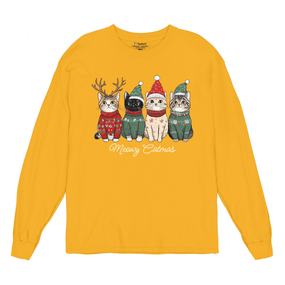A warm Meowy Catmas design with four cozy cats in holiday sweaters. Perfect for Christmas parties, winter gifting, and anyone who loves cute seasonal pets. Optimized with: Christmas cats, cat lover gift, holiday pets, winter cats, festive kittens, seasonal graphic, cozy holiday theme, Christmas humor, cute cats, holiday design.