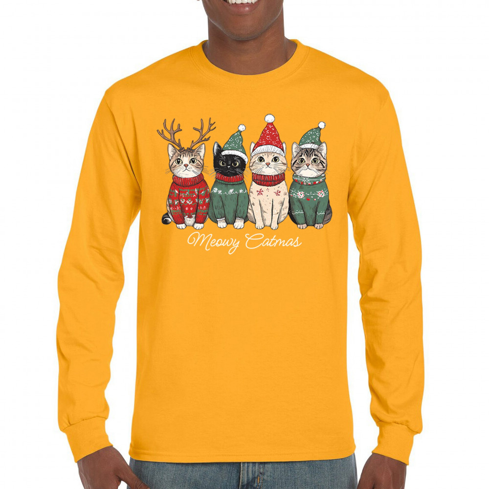 Cute Meowy Catmas design with festive kittens, perfect for cat lovers wanting a cozy holiday graphic and fun Christmas pet theme.