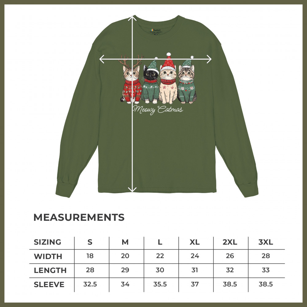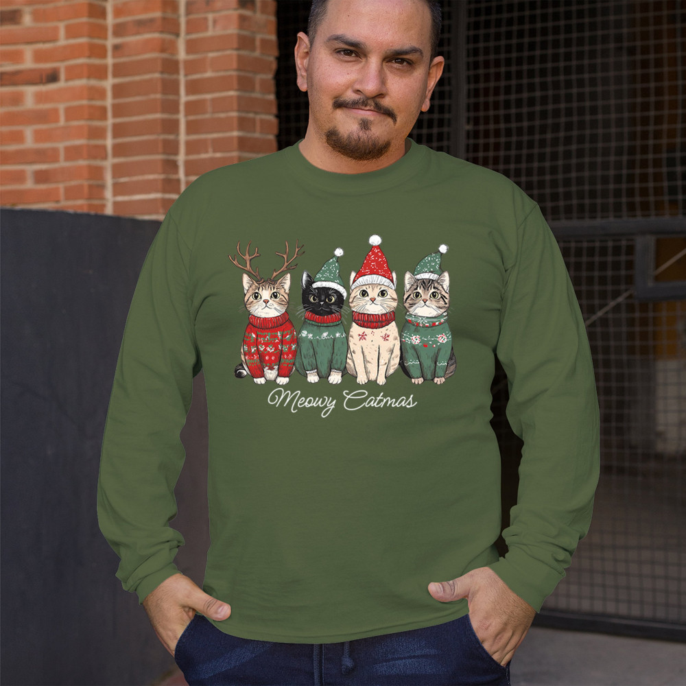 Cute Meowy Catmas design with festive kittens, perfect for cat lovers wanting a cozy holiday graphic and fun Christmas pet theme.