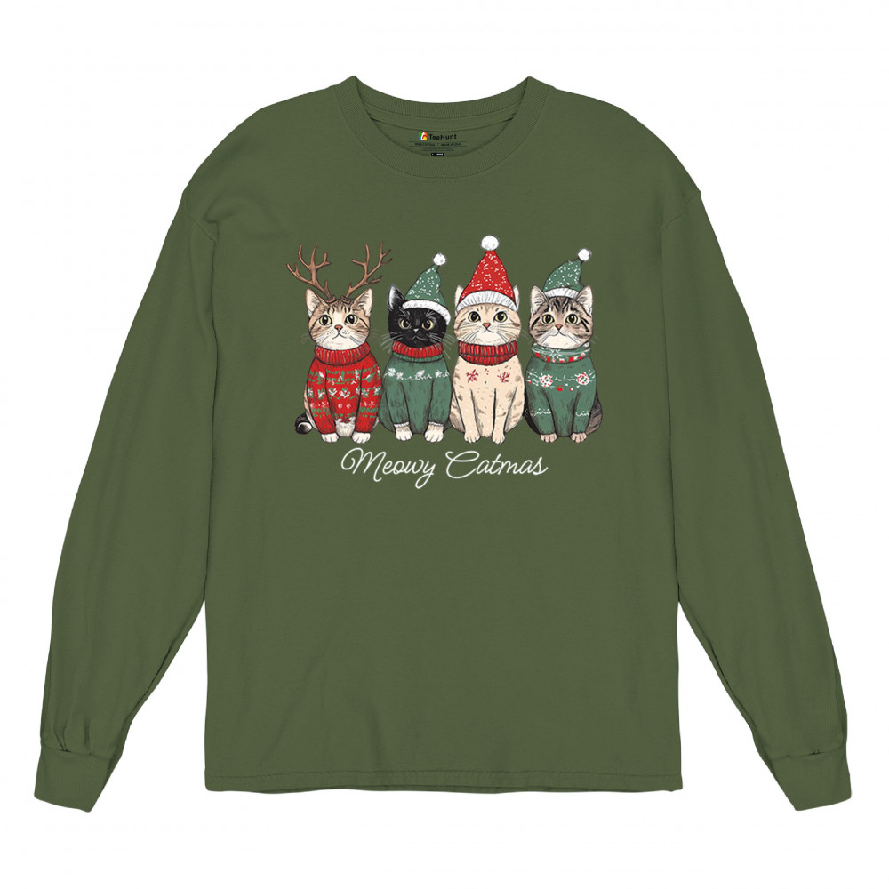 A warm Meowy Catmas design with four cozy cats in holiday sweaters. Perfect for Christmas parties, winter gifting, and anyone who loves cute seasonal pets. Optimized with: Christmas cats, cat lover gift, holiday pets, winter cats, festive kittens, seasonal graphic, cozy holiday theme, Christmas humor, cute cats, holiday design.