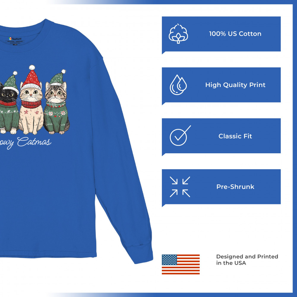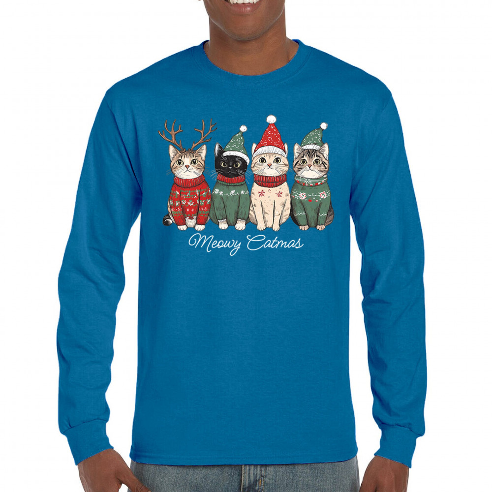 Cute Meowy Catmas design with festive kittens, perfect for cat lovers wanting a cozy holiday graphic and fun Christmas pet theme.
