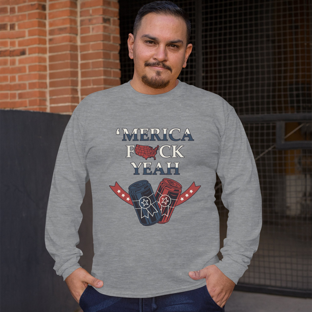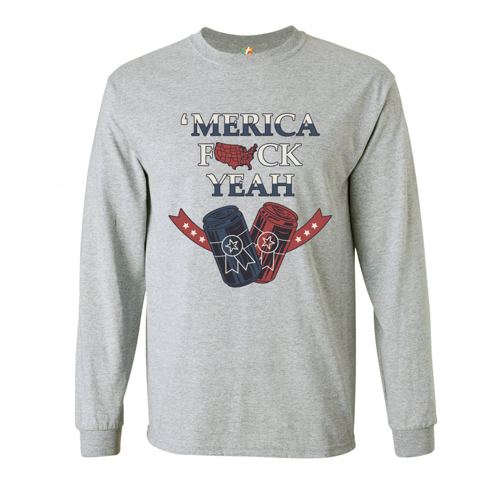 MERICA F*CK YEAH long sleeve t-shirt patriotic american pride drinking beer gray