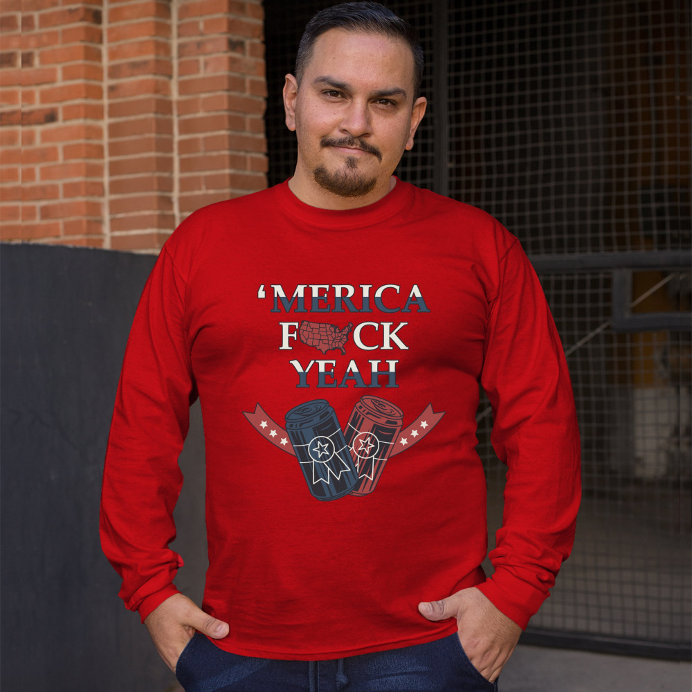 MERICA F*CK YEAH long sleeve t-shirt patriotic american pride drinking beer red