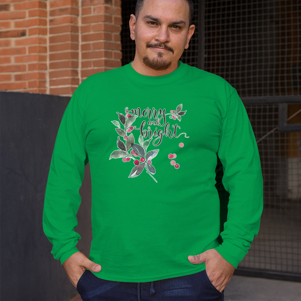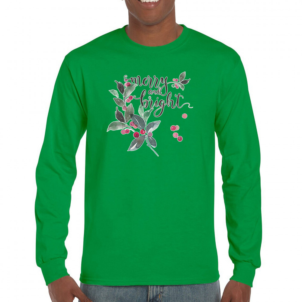 MERRY AND BRIGHT CUTE CHRISTMAS long sleeve t-shirt jolly santa clause xmas green