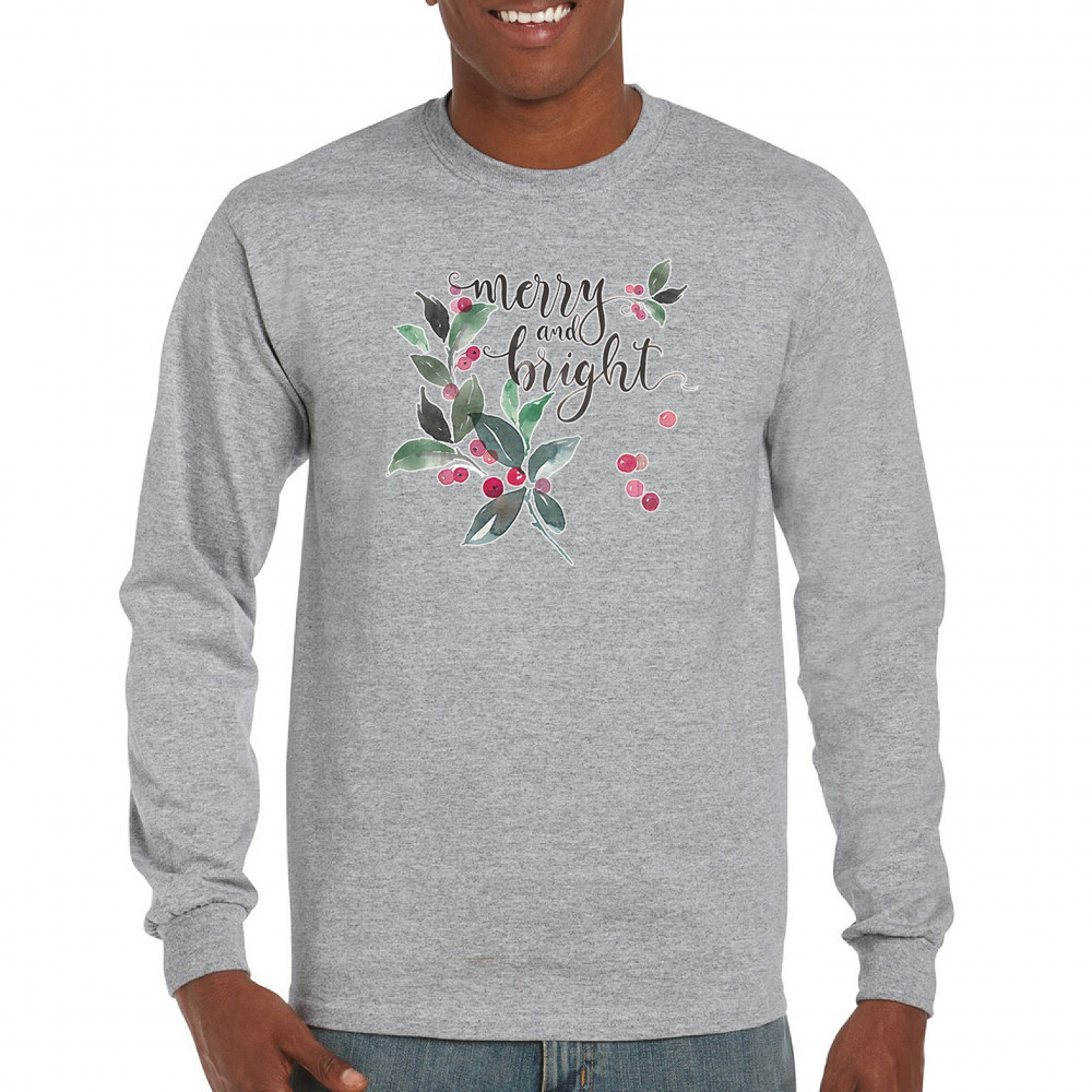 MERRY AND BRIGHT CUTE CHRISTMAS long sleeve t-shirt jolly santa clause xmas gray