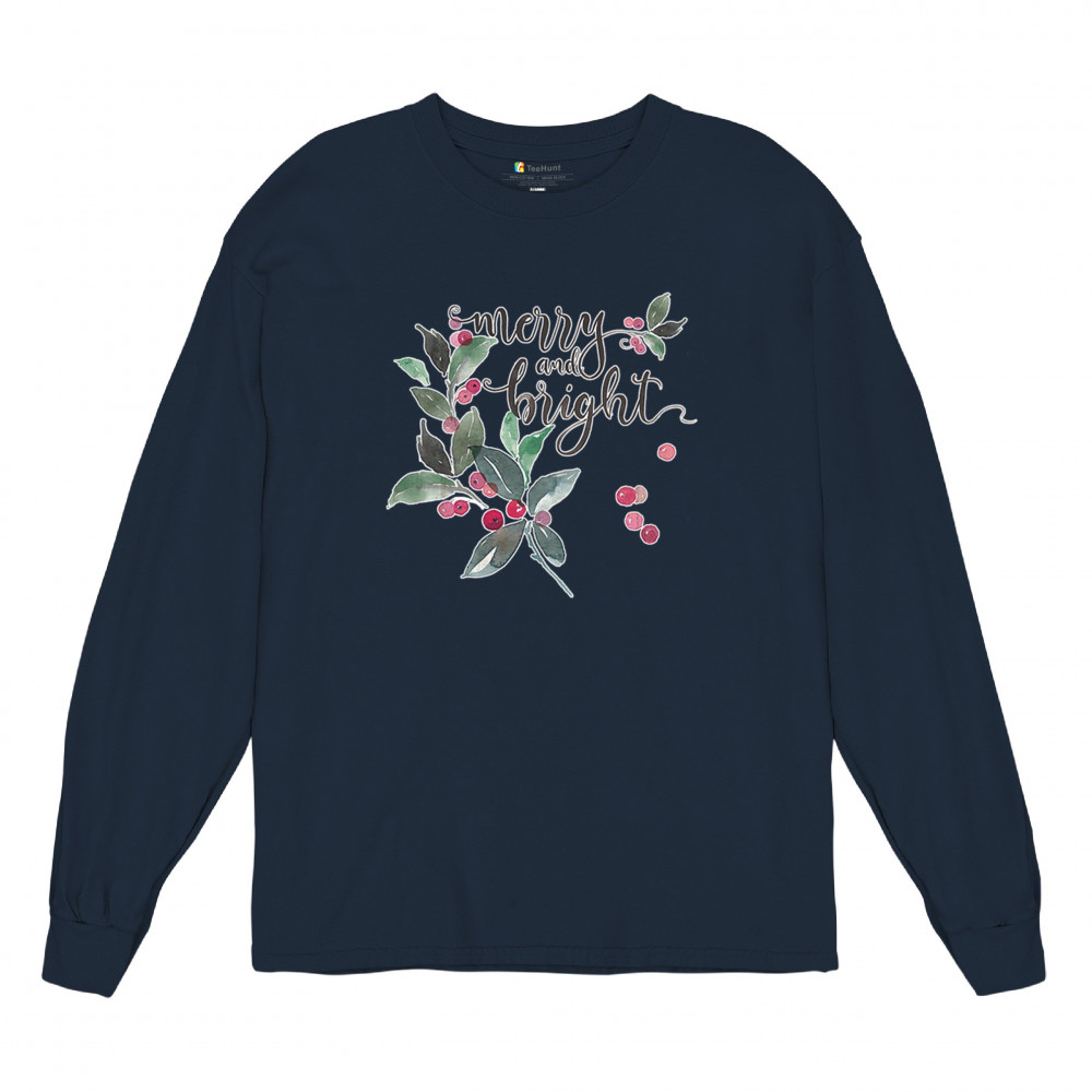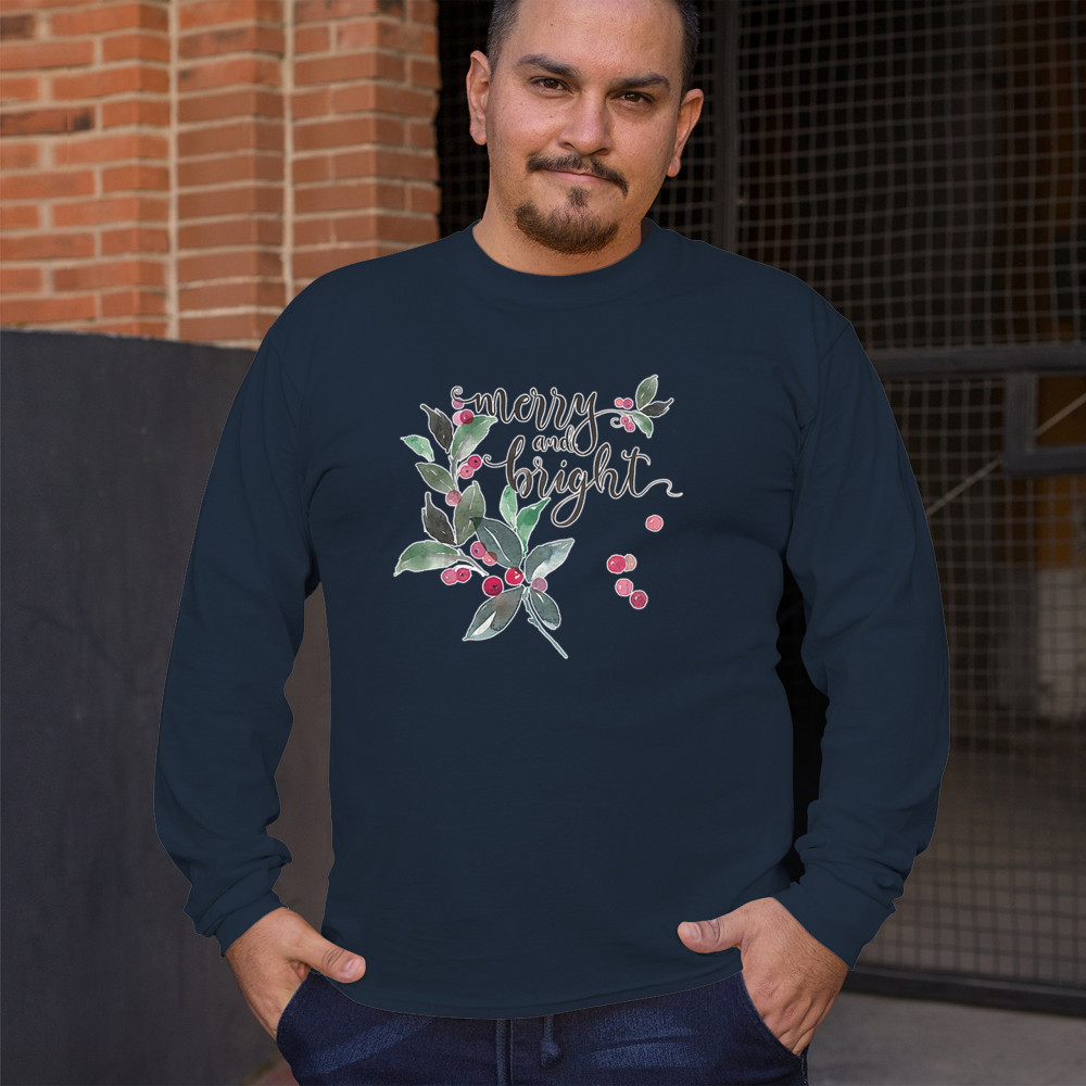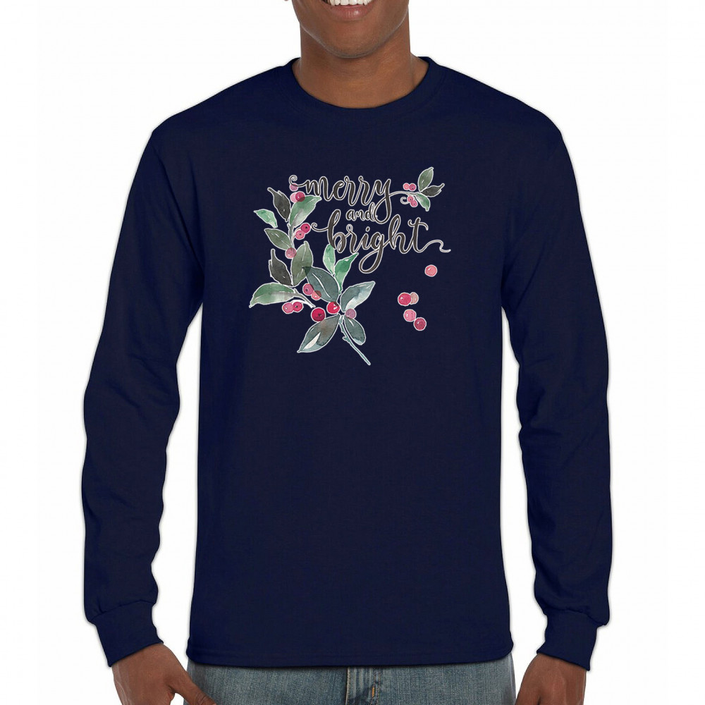 MERRY AND BRIGHT CUTE CHRISTMAS long sleeve t-shirt jolly santa clause xmas navy blue