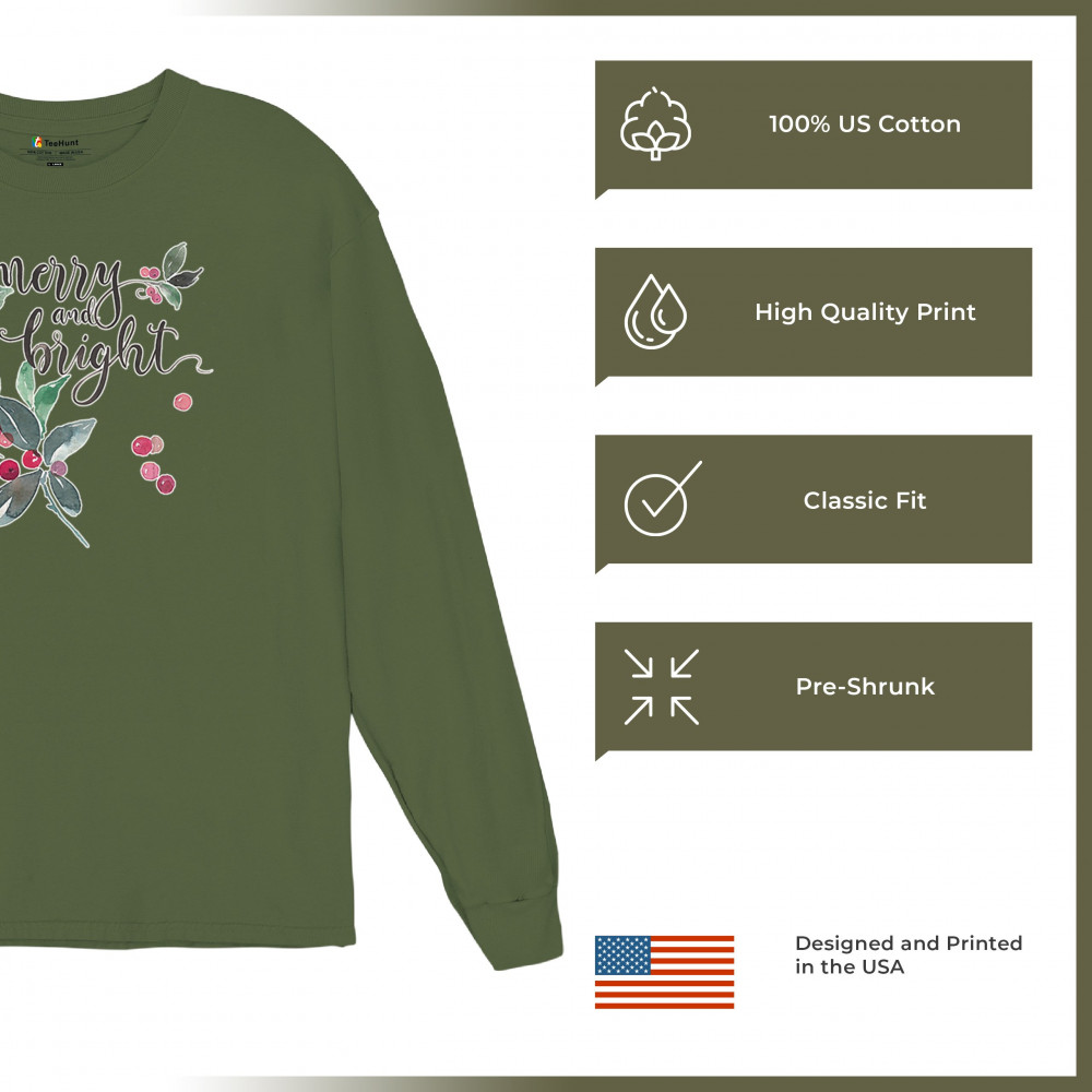 MERRY AND BRIGHT CUTE CHRISTMAS long sleeve t-shirt jolly santa clause xmas military green