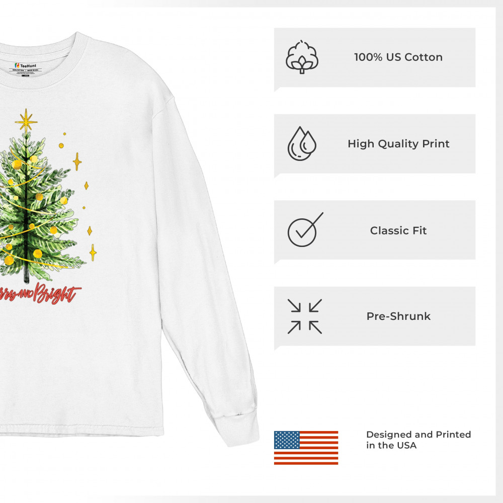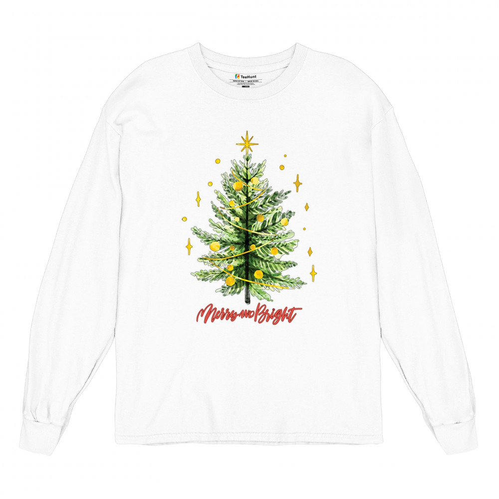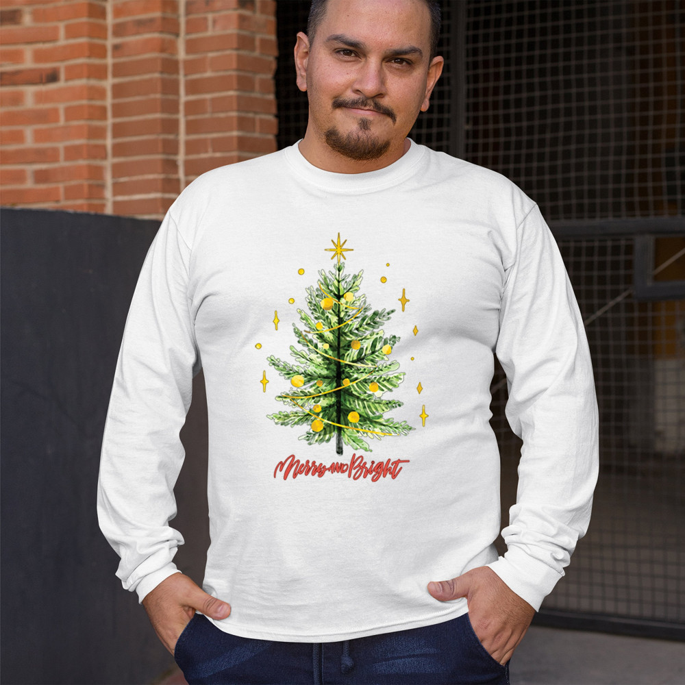 Festive “Merry and Bright†shirt featuring a joyful Christmas tree. Perfect for holiday gatherings, office parties, or Secret Santa gifts.