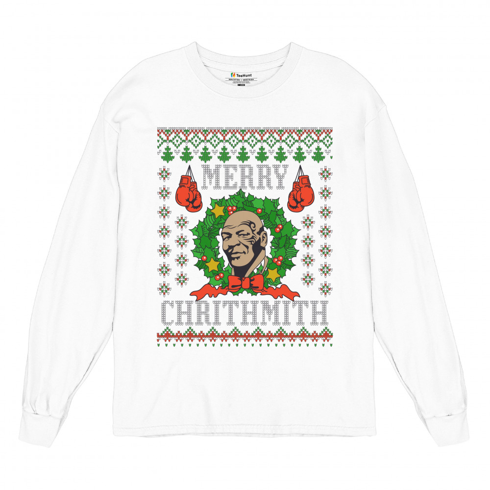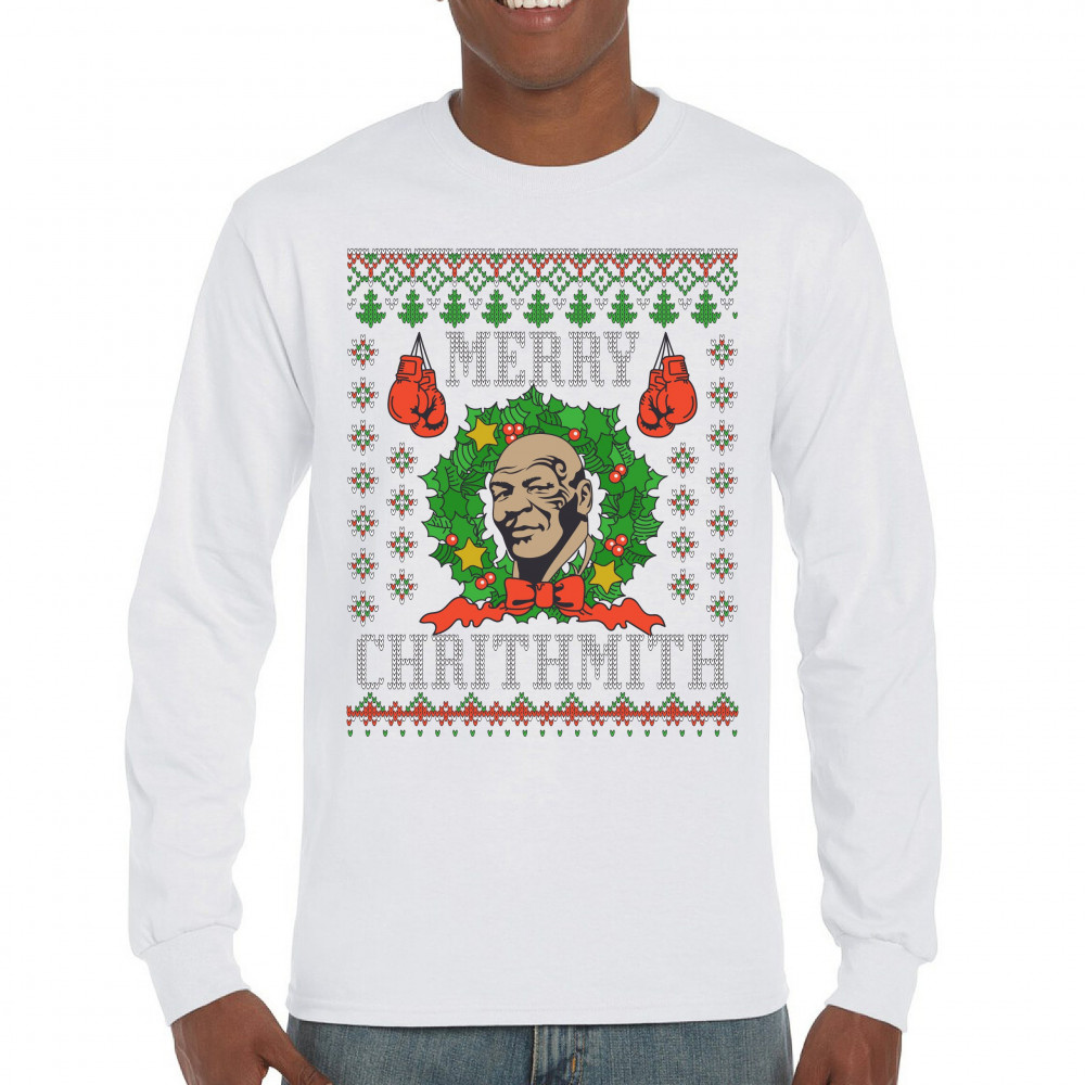 A print saying: "Merry Chrithmith" and featuring the face of Mike Tyson inside of a Christmas chaplet and two pairs of boxing gloves. The print is designed as an ugly sweater. Amazing choice to make people smile and spread positive vibes on Christmas Eve.