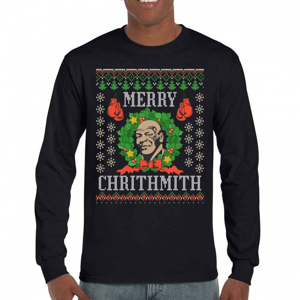 A print saying: "Merry Chrithmith" and featuring the face of Mike Tyson inside of a Christmas chaplet and two pairs of boxing gloves. The print is designed as an ugly sweater. Amazing choice to make people smile and spread positive vibes on Christmas Eve.