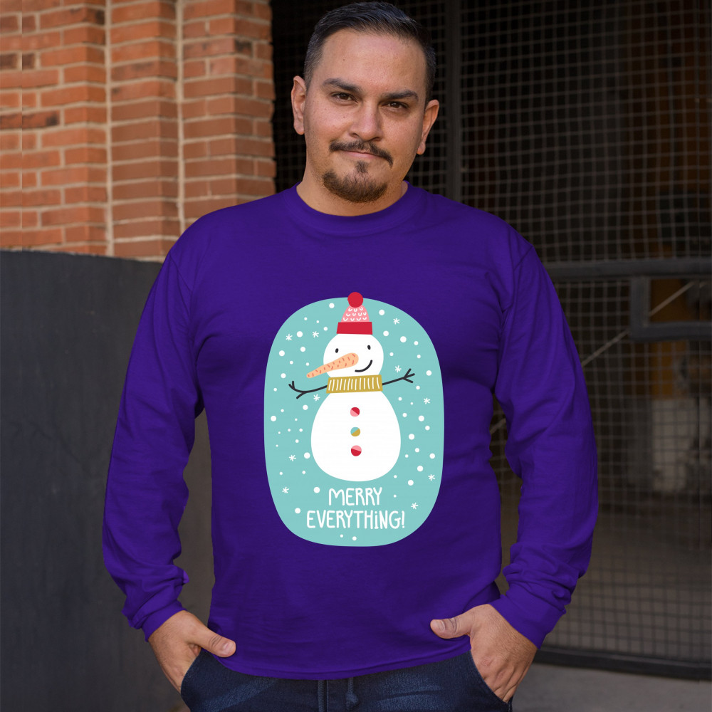 A print featuring a happy snowman with a carrot nose wearing a hat and a scarf smiling and spreading it's hands. It is snowing and below the snowman it says: "Merry Christmas". Amazing choice to make people smile and spread positive vibes on Christmas Eve