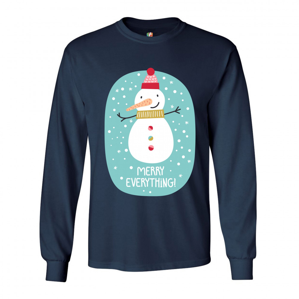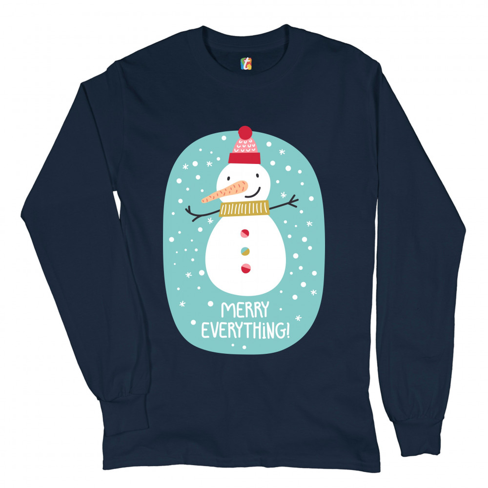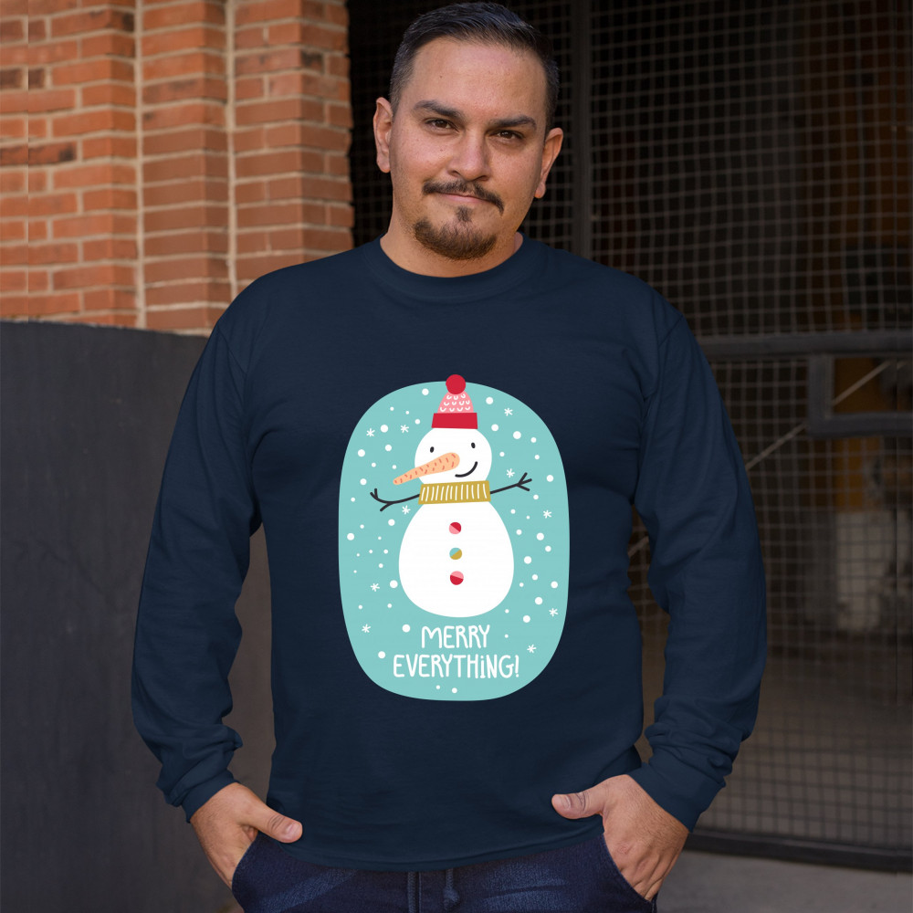 A print featuring a happy snowman with a carrot nose wearing a hat and a scarf smiling and spreading it's hands. It is snowing and below the snowman it says: "Merry Christmas". Amazing choice to make people smile and spread positive vibes on Christmas Eve