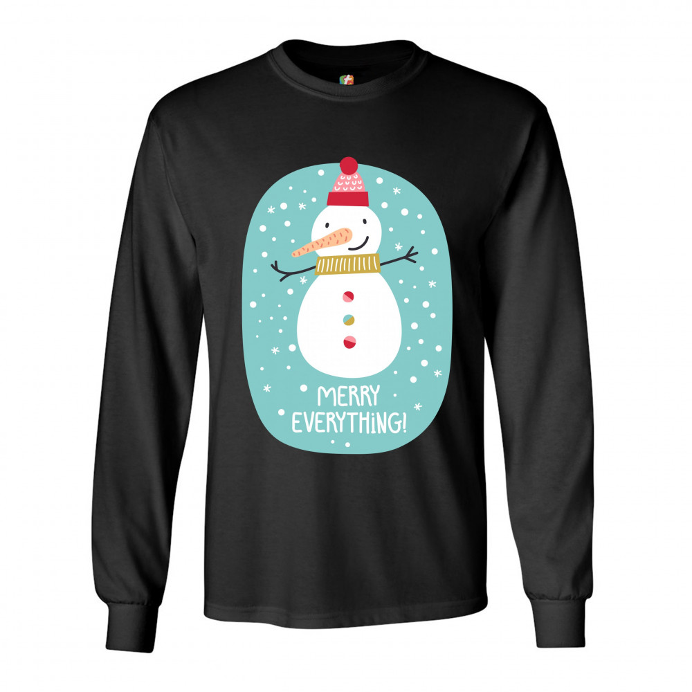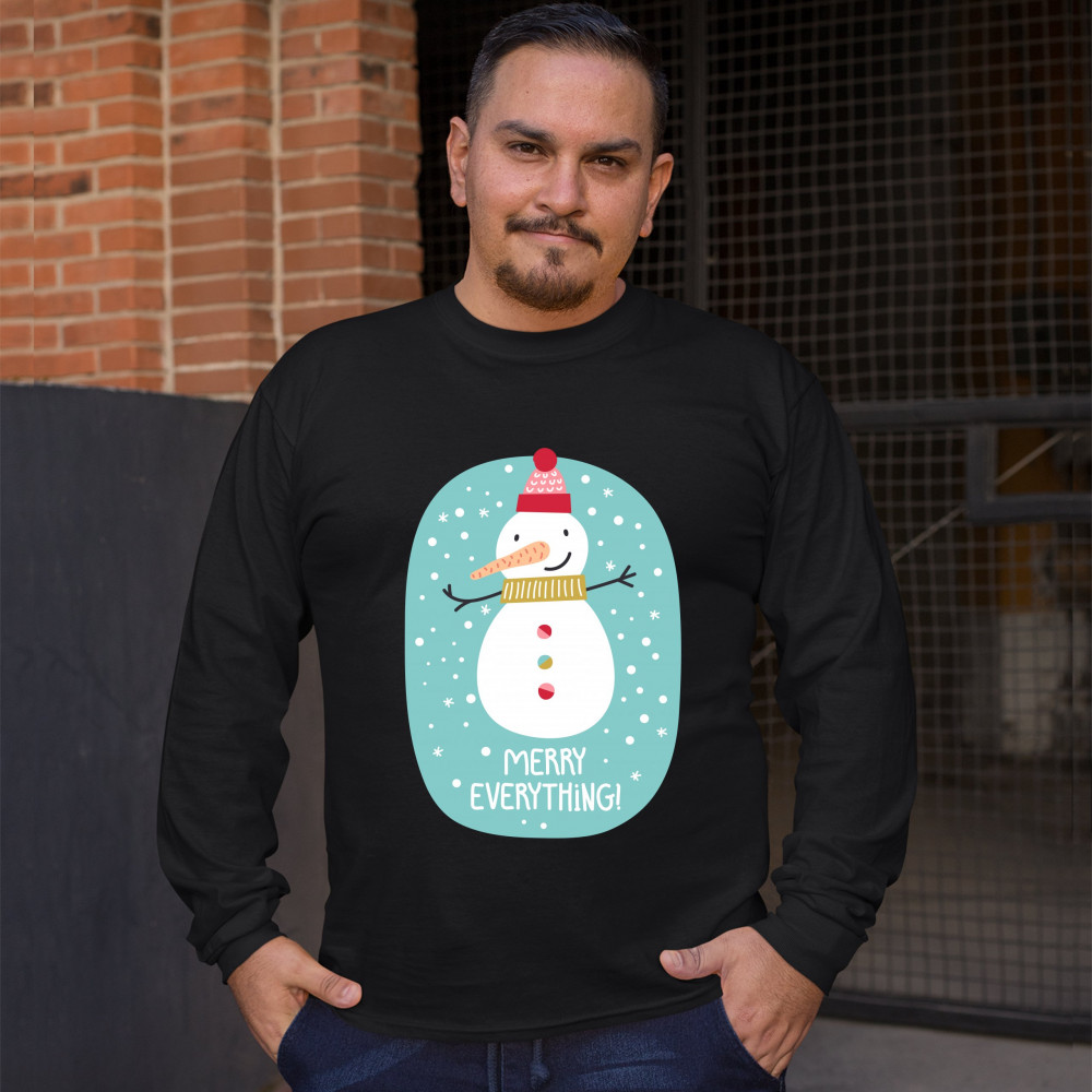 A print featuring a happy snowman with a carrot nose wearing a hat and a scarf smiling and spreading it's hands. It is snowing and below the snowman it says: "Merry Christmas". Amazing choice to make people smile and spread positive vibes on Christmas Eve
