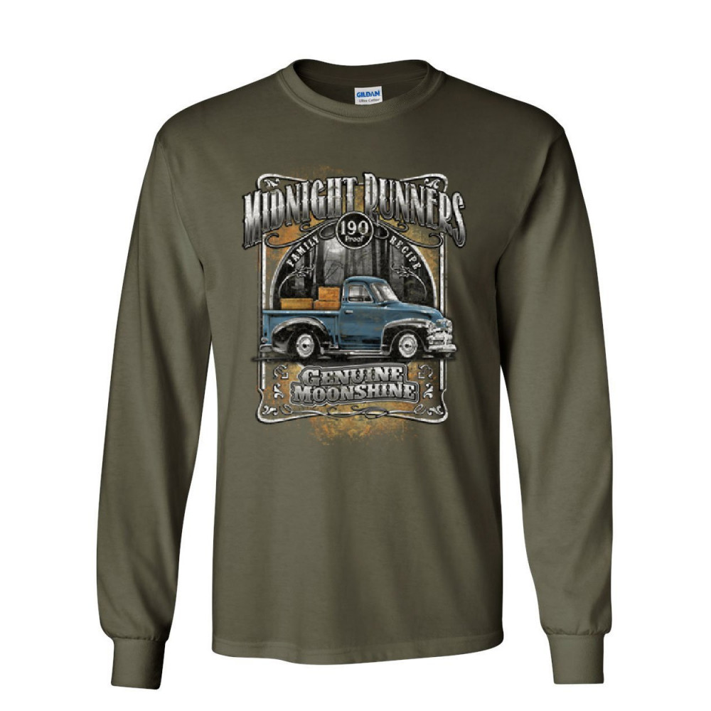 MIDNIGHT RUNNERS long sleeve t-shirt genuine moonshine drinking whisky booze tee military green
