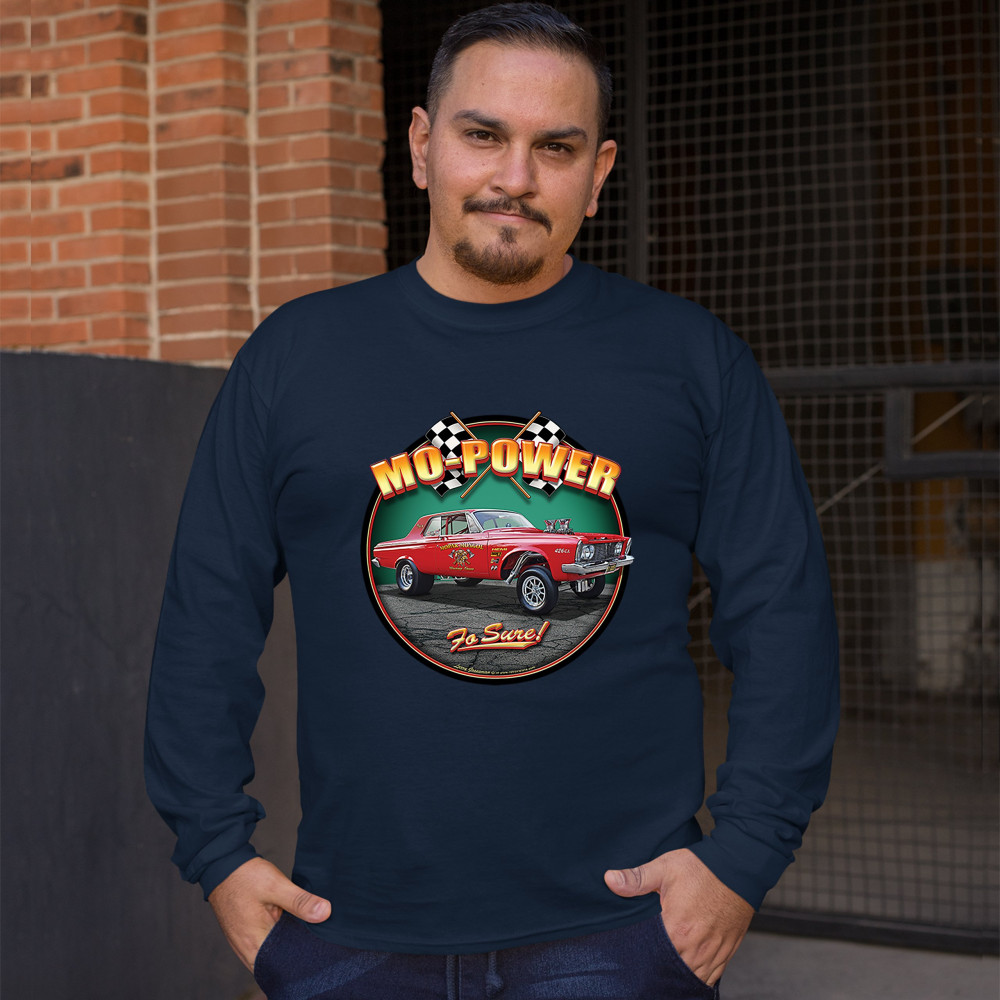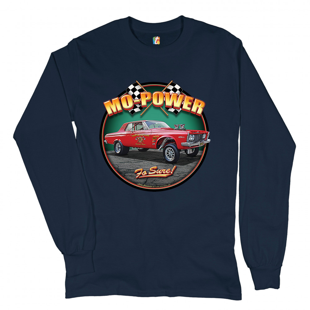 MO-POWER FO SURE! long sleeve t-shirt american muscle car racing route 66 navy blue