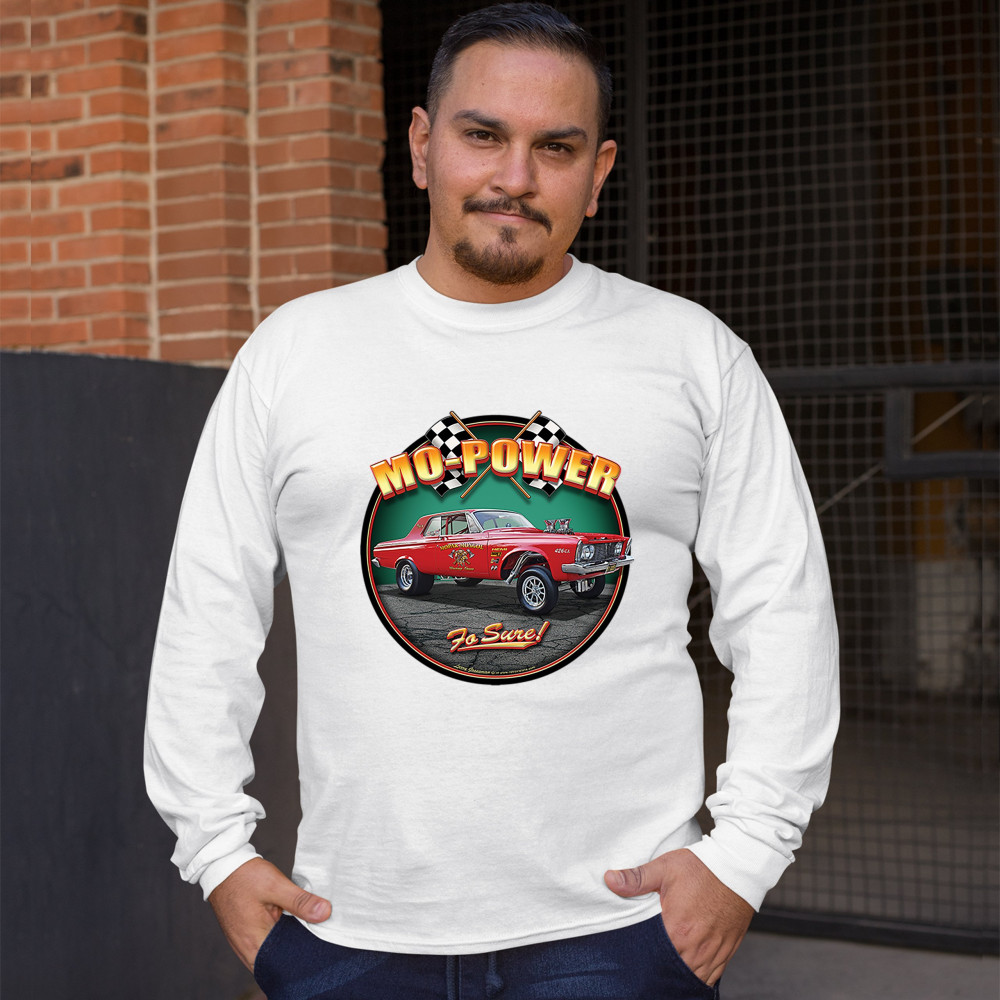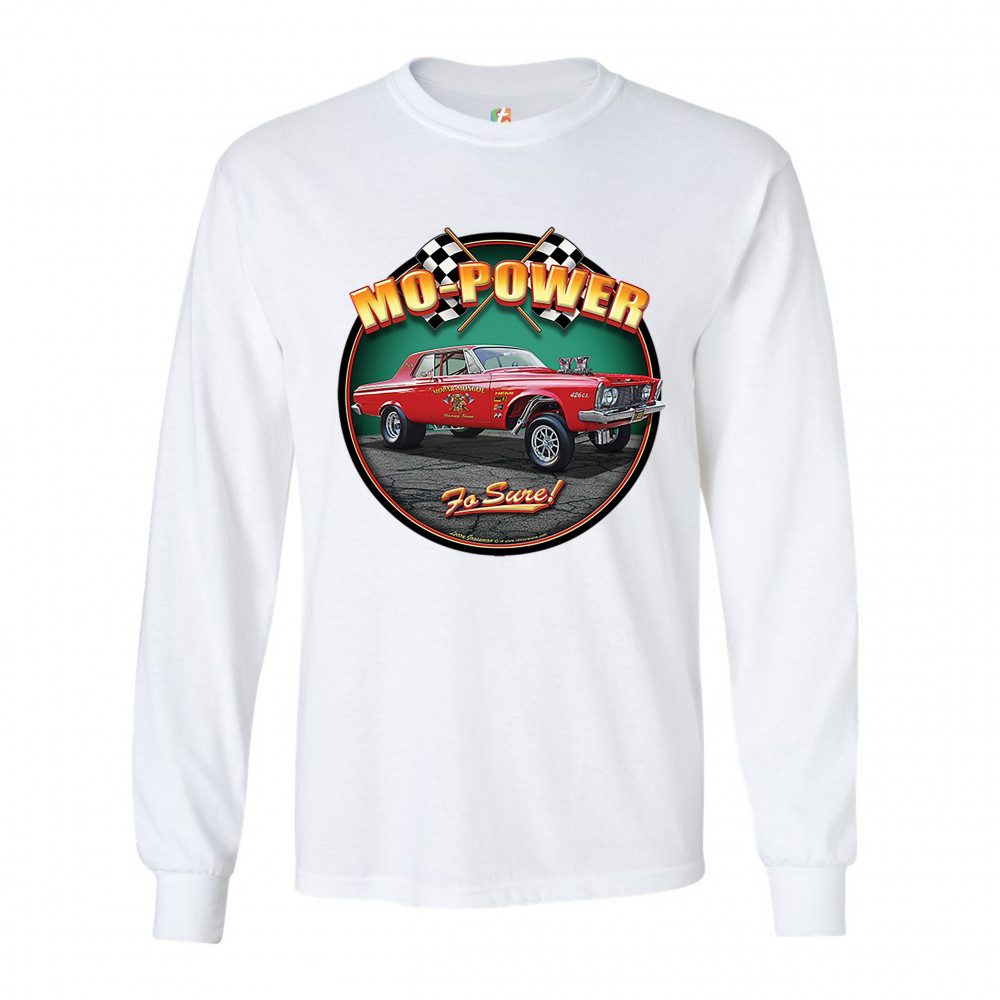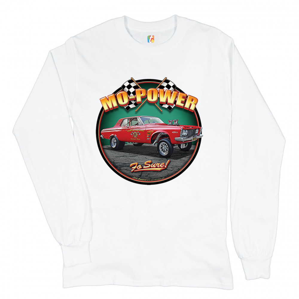 MO-POWER FO SURE! long sleeve t-shirt american muscle car racing route 66 white