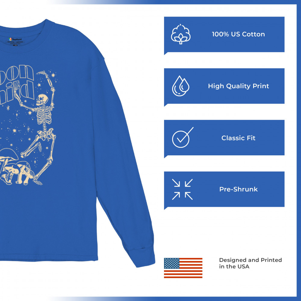 Step into cosmic wonder with this “Moon Child†design—featuring a skeleton in motion beneath a crescent moon, surrounded by stars and enchanted mushrooms. A perfect mix of gothic energy, lunar love, psychedelic art, and spiritual vibes. Ideal for festivals, vintage dreamers, or anyone guided by moonlight and magic.