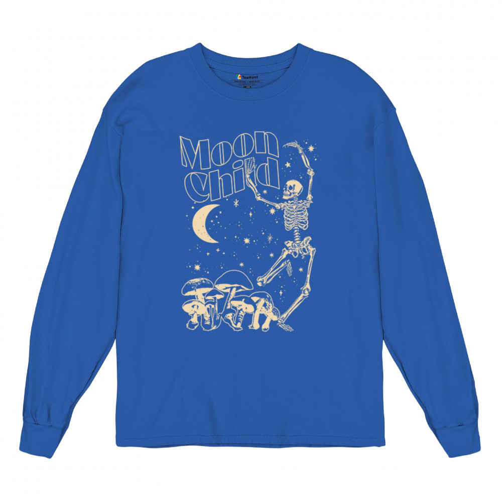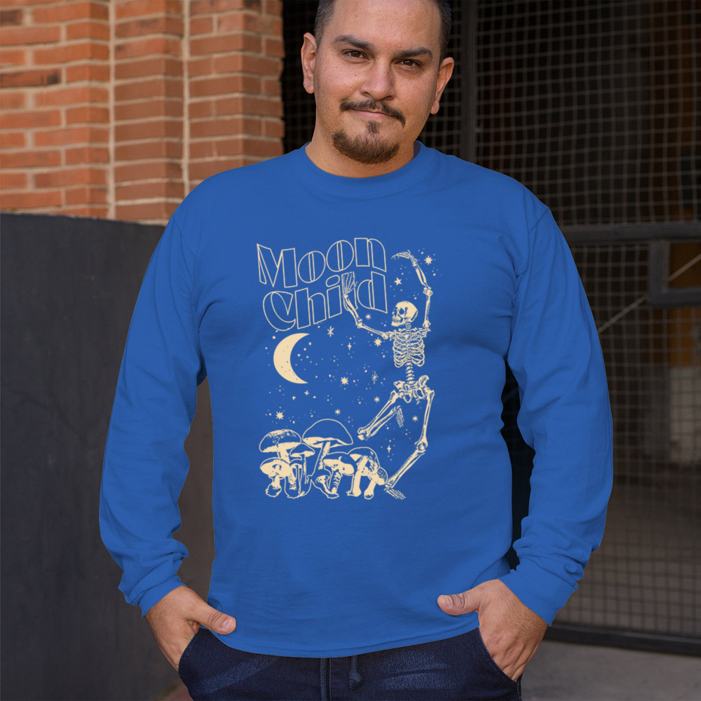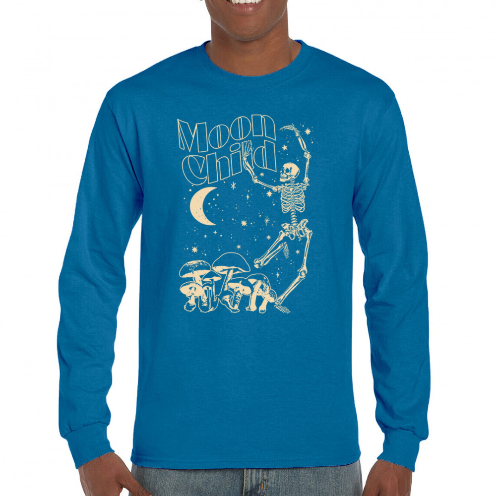 Mystical “Moon Child†design with skeleton, mushrooms, stars, and moon. Retro celestial vibes for dreamers, witches, and free spirits.