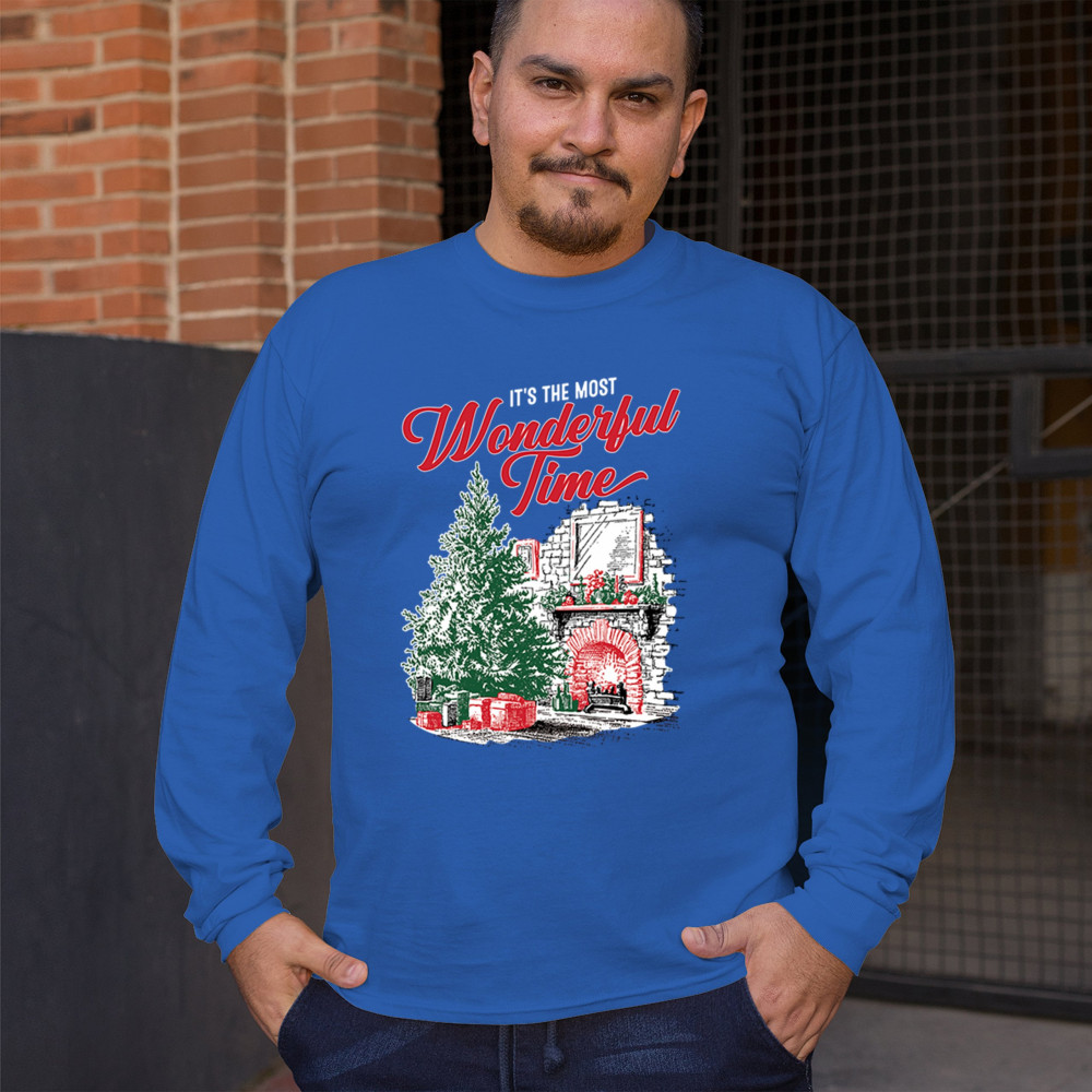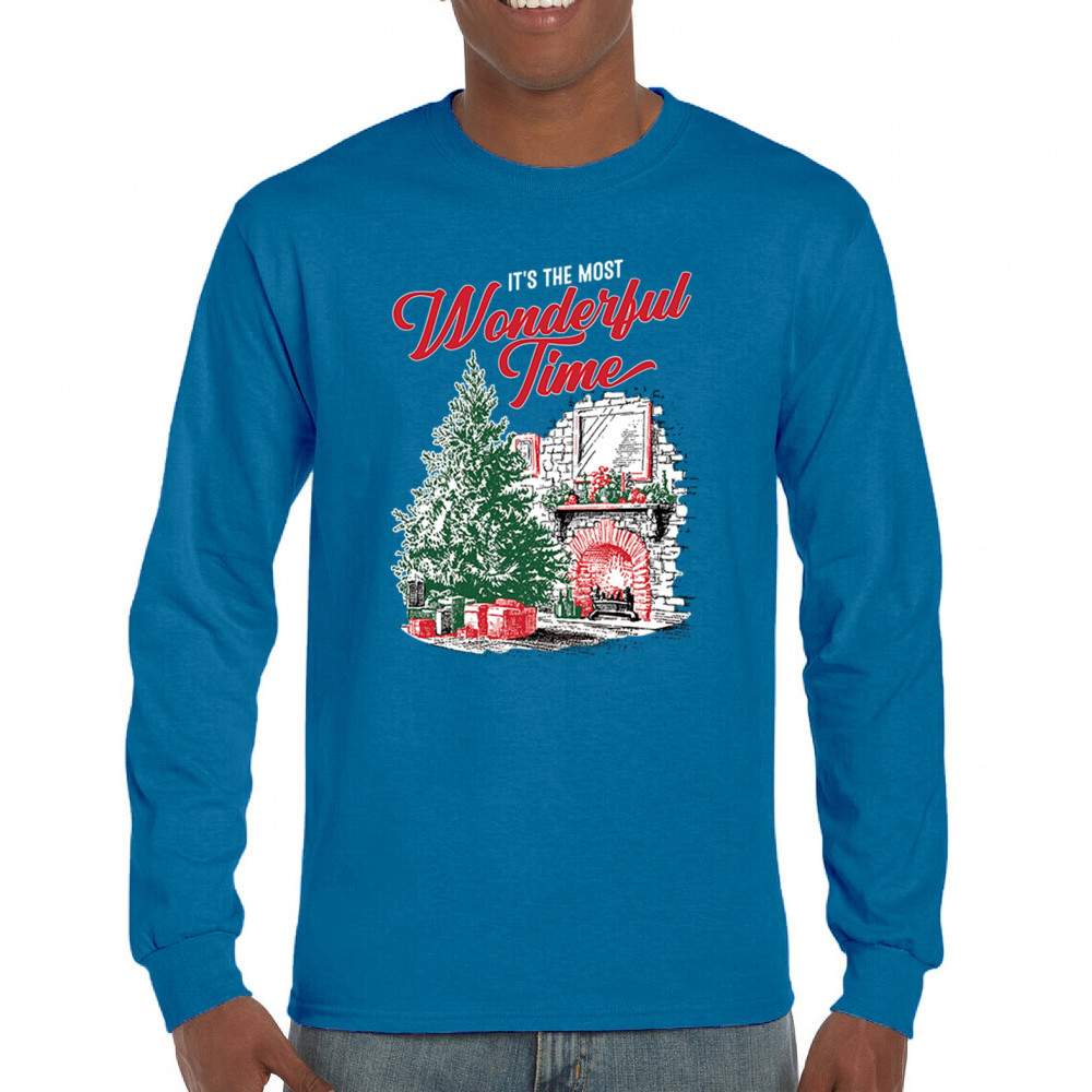 Make your holidays brighter with this “Most Wonderful Time†Christmas design, featuring a glowing fireplace, festive living room, and decorated Christmas tree. This cozy Christmas shirt combines holiday home decor style with classic Merry Xmas charm. Perfect for those who love Santa Claus, Rudolph, reindeer, Let It Snow vibes, and cheerful holiday fashion.