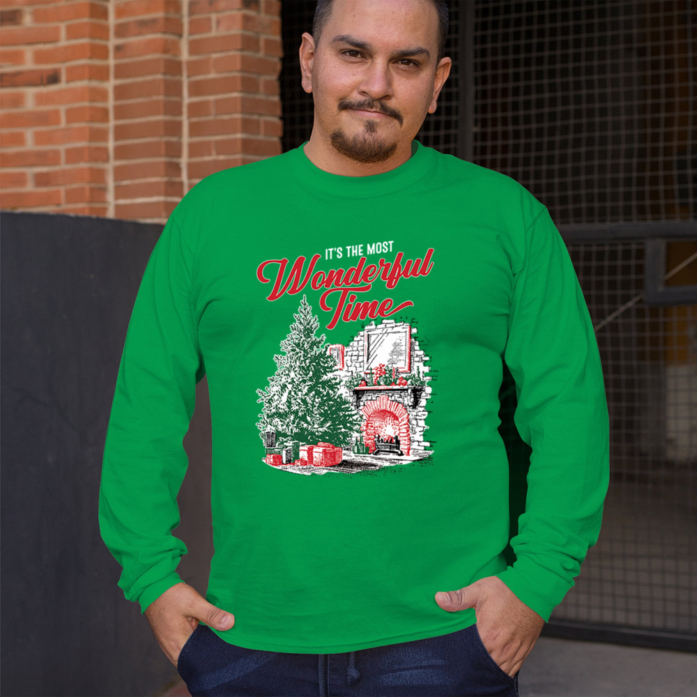 Make your holidays brighter with this “Most Wonderful Time†Christmas design, featuring a glowing fireplace, festive living room, and decorated Christmas tree. This cozy Christmas shirt combines holiday home decor style with classic Merry Xmas charm. Perfect for those who love Santa Claus, Rudolph, reindeer, Let It Snow vibes, and cheerful holiday fashion.
