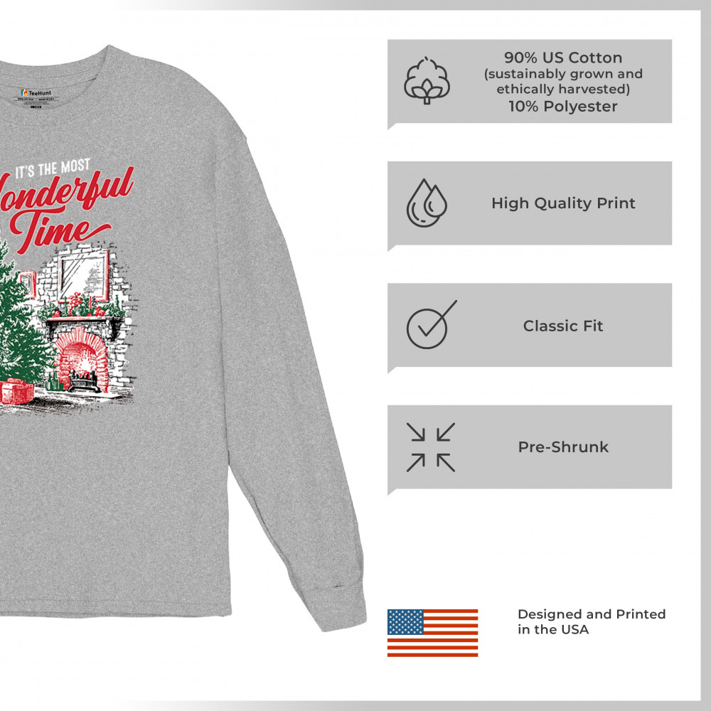 Make your holidays brighter with this “Most Wonderful Time†Christmas design, featuring a glowing fireplace, festive living room, and decorated Christmas tree. This cozy Christmas shirt combines holiday home decor style with classic Merry Xmas charm. Perfect for those who love Santa Claus, Rudolph, reindeer, Let It Snow vibes, and cheerful holiday fashion.