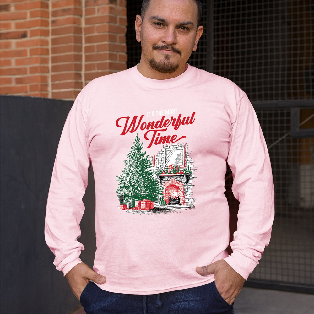 Make your holidays brighter with this “Most Wonderful Time†Christmas design, featuring a glowing fireplace, festive living room, and decorated Christmas tree. This cozy Christmas shirt combines holiday home decor style with classic Merry Xmas charm. Perfect for those who love Santa Claus, Rudolph, reindeer, Let It Snow vibes, and cheerful holiday fashion.