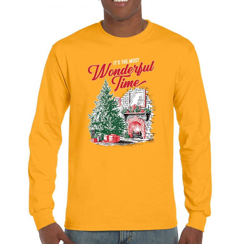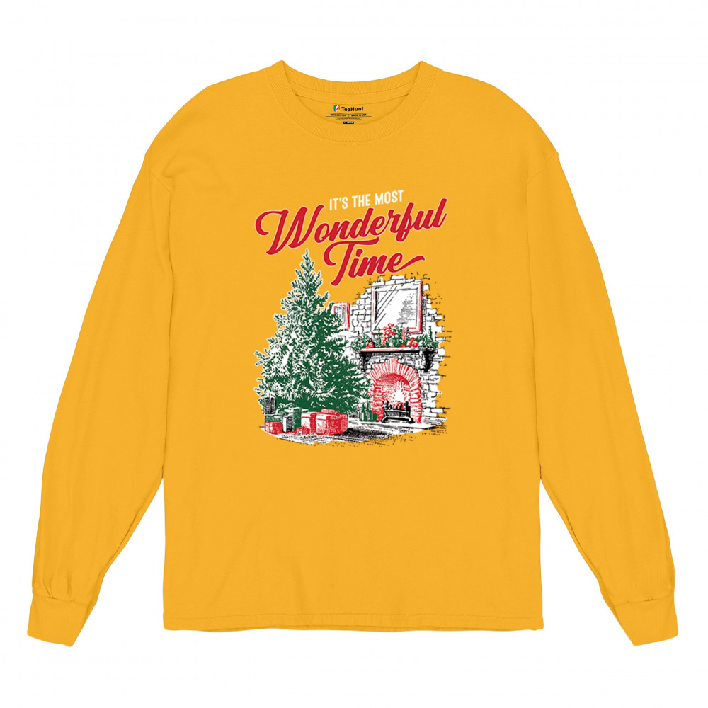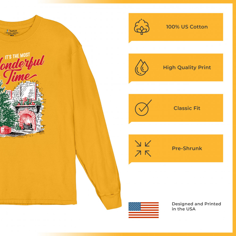 Make your holidays brighter with this “Most Wonderful Time†Christmas design, featuring a glowing fireplace, festive living room, and decorated Christmas tree. This cozy Christmas shirt combines holiday home decor style with classic Merry Xmas charm. Perfect for those who love Santa Claus, Rudolph, reindeer, Let It Snow vibes, and cheerful holiday fashion.