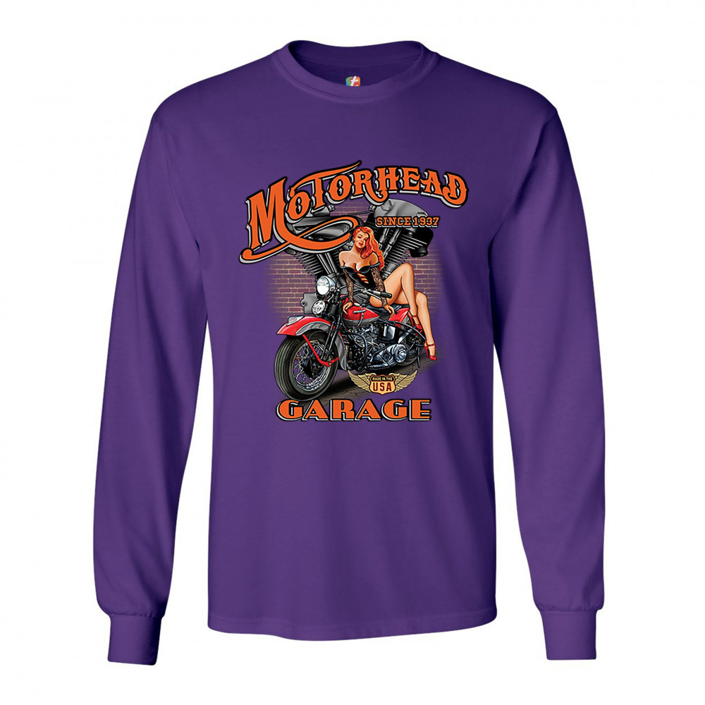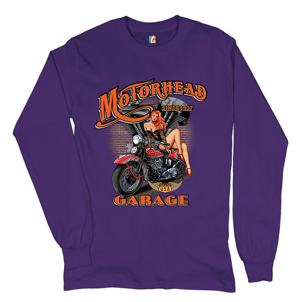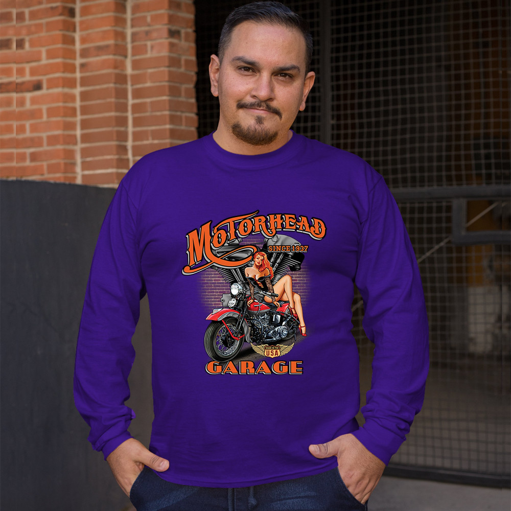 A print featuring a sexy pin-up girl sitting on a motorcycle. In the background there is a motorcycle engine and a brick wall. The print says: "Motorhead Garage since 1937" and features a "Made in the USA" sign. A great choice for a motorcycle enthusiast.