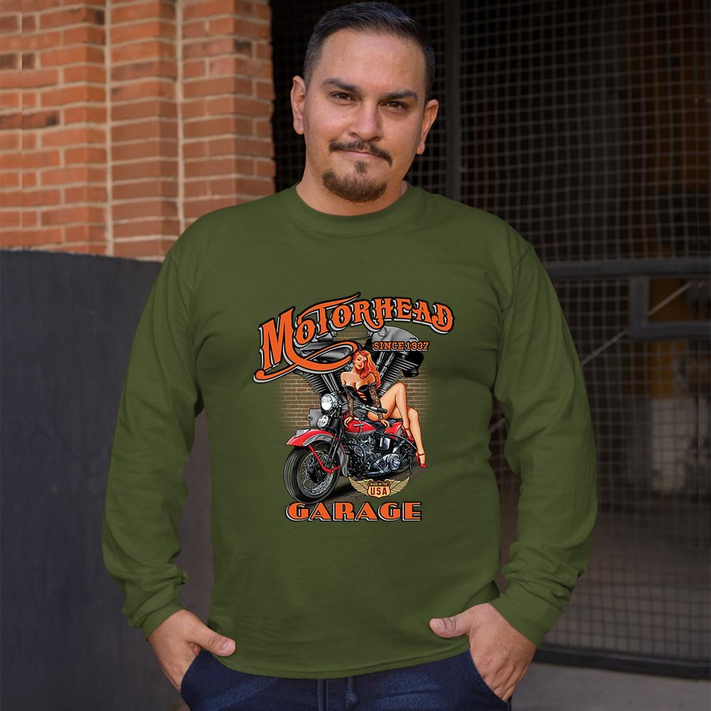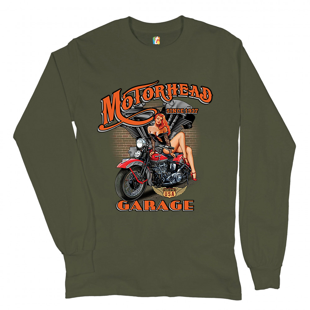 MOTORHEAD GARAGE long sleeve t-shirt biker chopper motorcycle pin-up girl military green