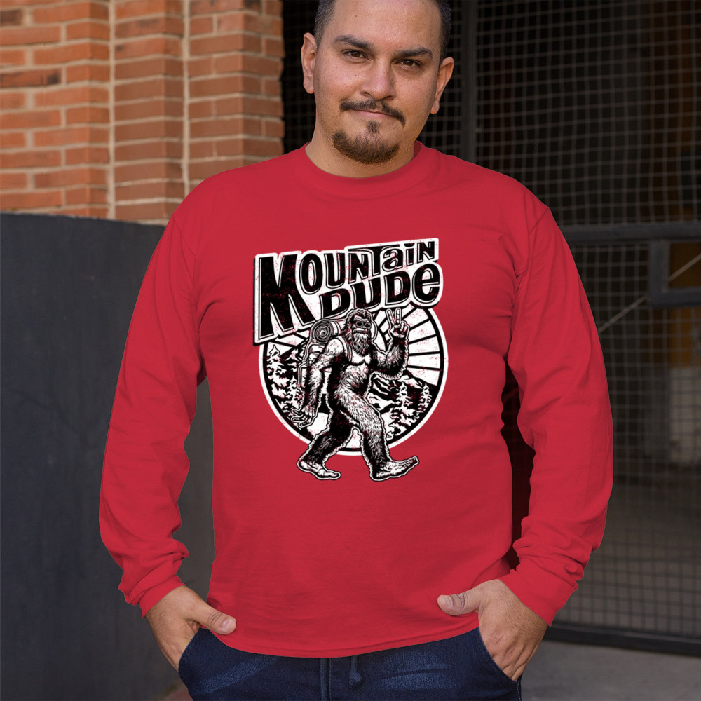 Celebrate outdoor adventures with the "Mountain Dude" design, featuring Sasquatch and mountain scenery. Perfect for hikers, campers, and Bigfoot fans.
