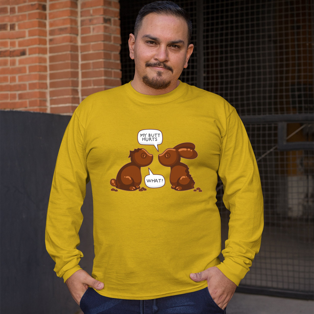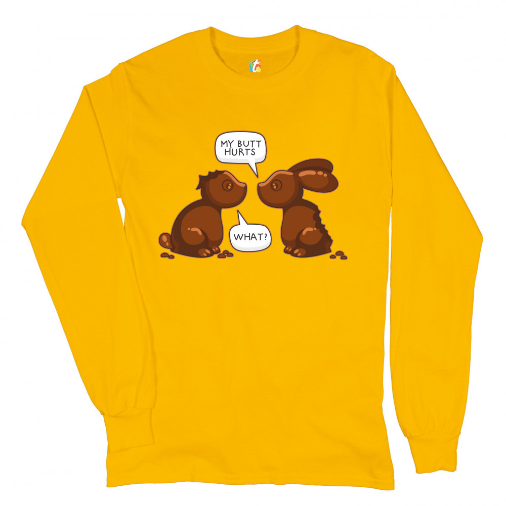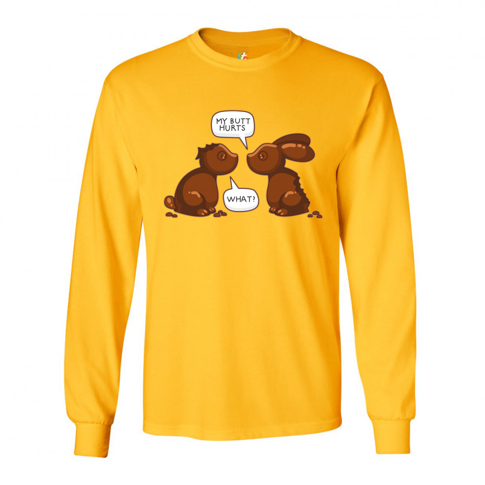 MY BUTT HURTS - WHAT? long sleeve t-shirt chocolate bunnies easter rabbits yellow