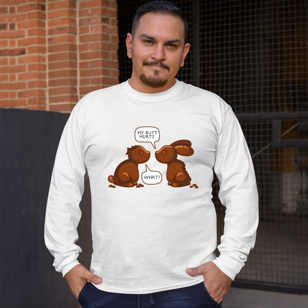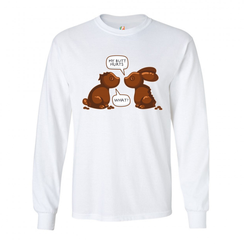 MY BUTT HURTS - WHAT? long sleeve t-shirt chocolate bunnies easter rabbits white