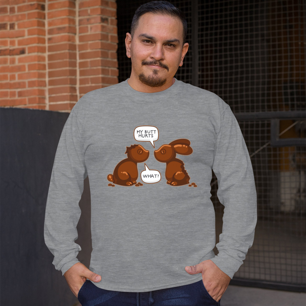 MY BUTT HURTS - WHAT? long sleeve t-shirt chocolate bunnies easter rabbits gray