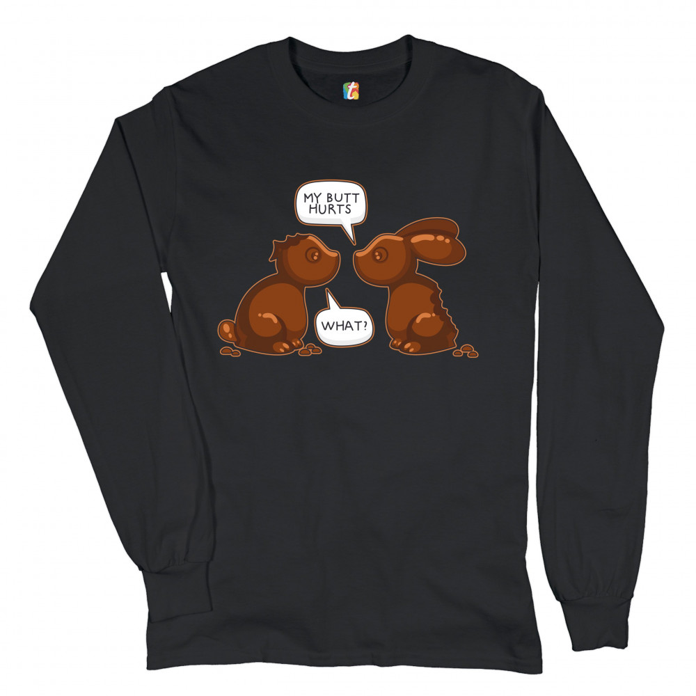 MY BUTT HURTS - WHAT? long sleeve t-shirt chocolate bunnies easter rabbits black