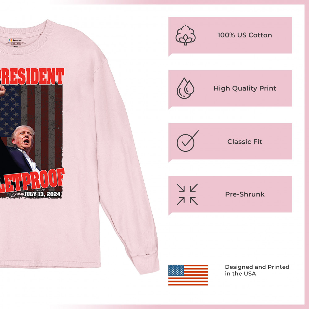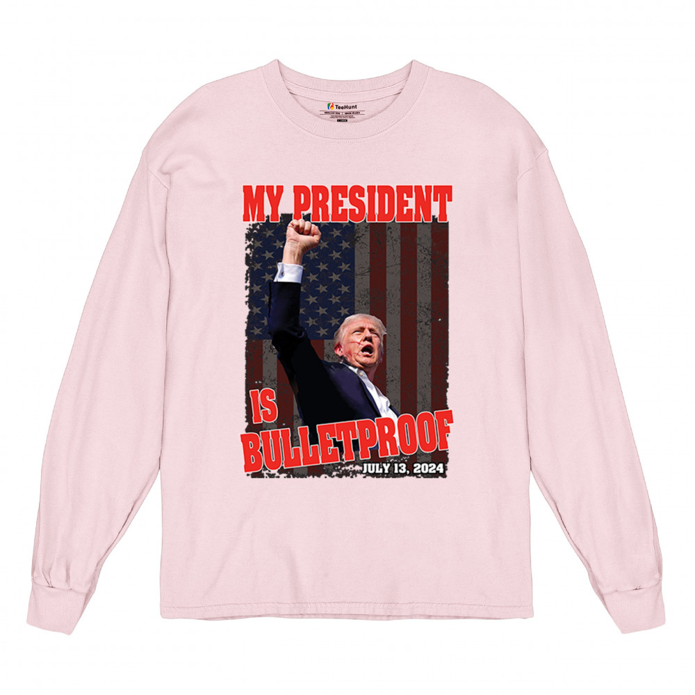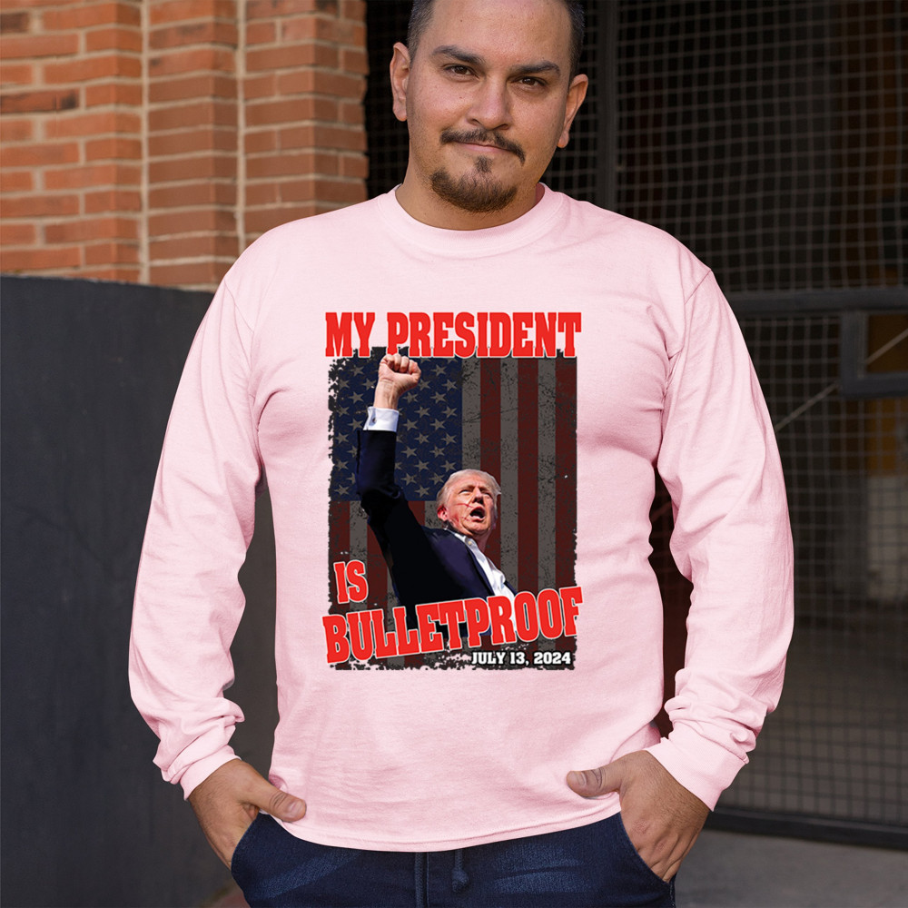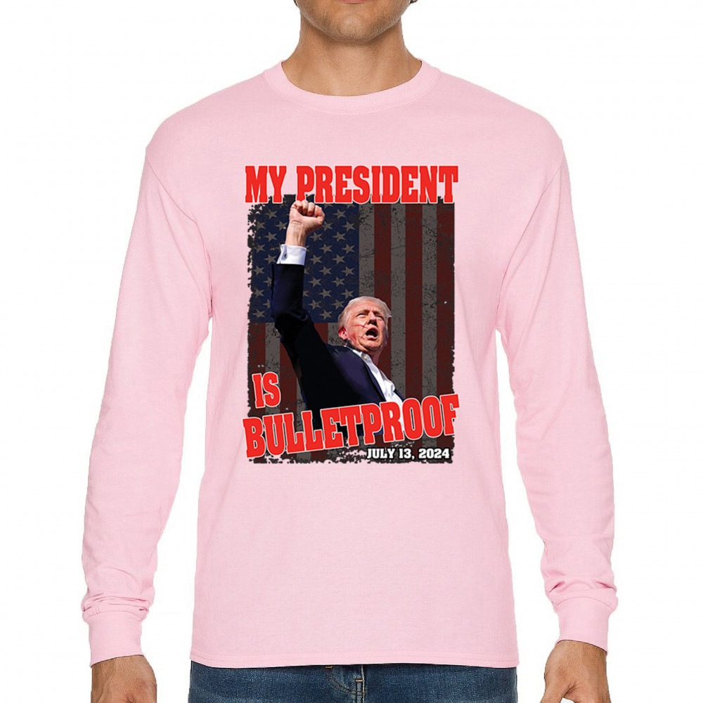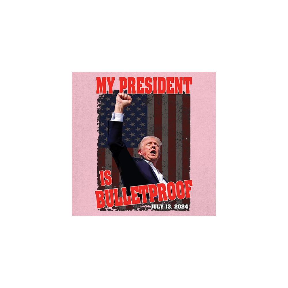 Support Trump with our "My President is Bulletproof" design, perfect for rallies and everyday wear. Show your patriotic pride and conservative values.