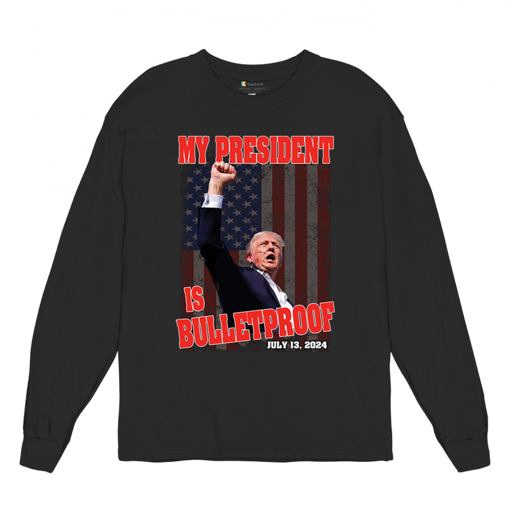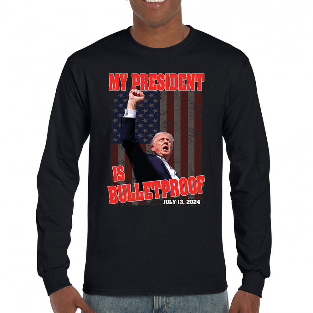 Support Trump with our "My President is Bulletproof" design, perfect for rallies and everyday wear. Show your patriotic pride and conservative values.