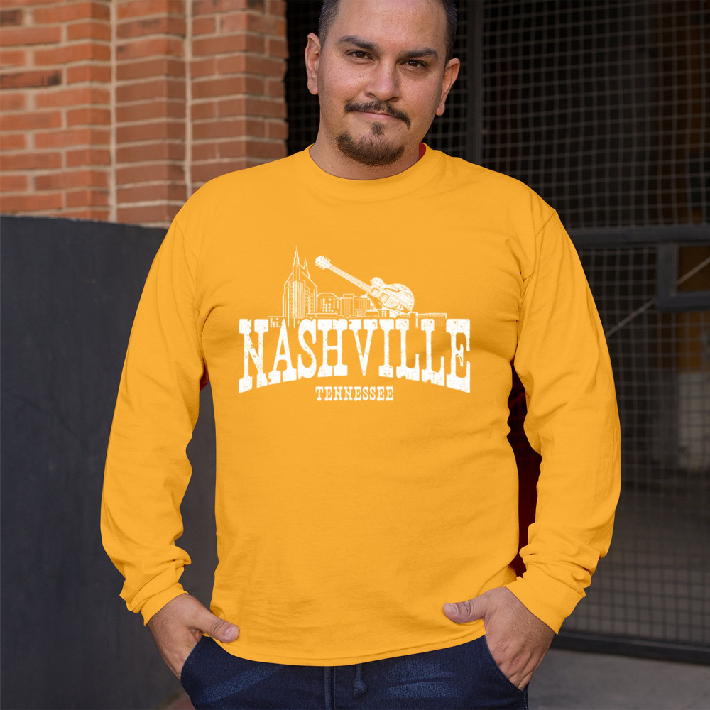 Celebrate the rhythm of Music City with this Nashville design featuring a detailed skyline and classic guitar illustration. Whether you're exploring downtown Tennessee, heading to a concert, or repping southern pride on the road, this vintage-inspired Nashville graphic brings iconic charm to any casual outing.
