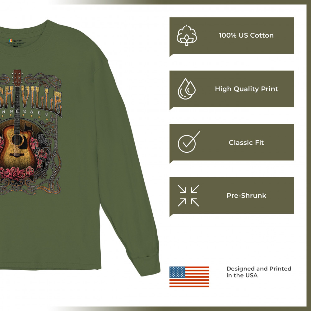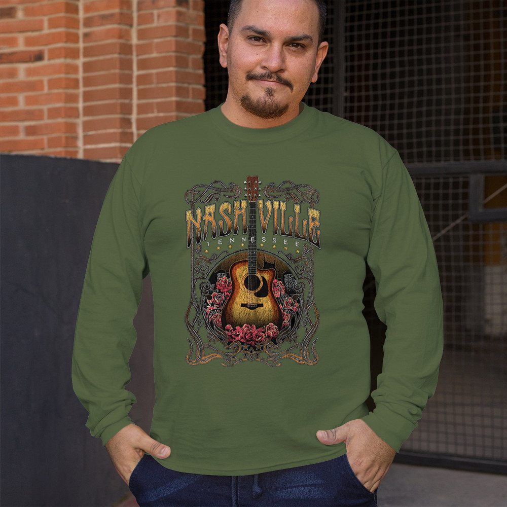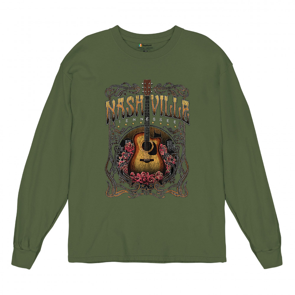 Vintage Nashville Tennessee design with rustic guitar and roses. Great for concerts, country music fans, road trips, and souvenir wear.
