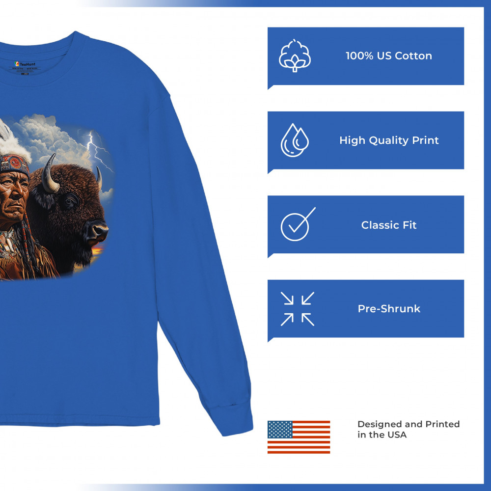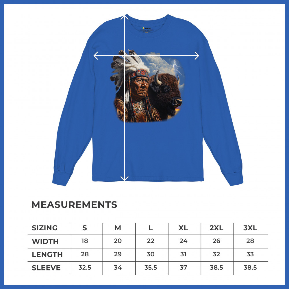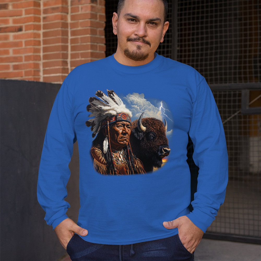 Bold tribal elder and bison design framed by lightning sky—honoring heritage, strength, resilience, and sacred connection to nature.