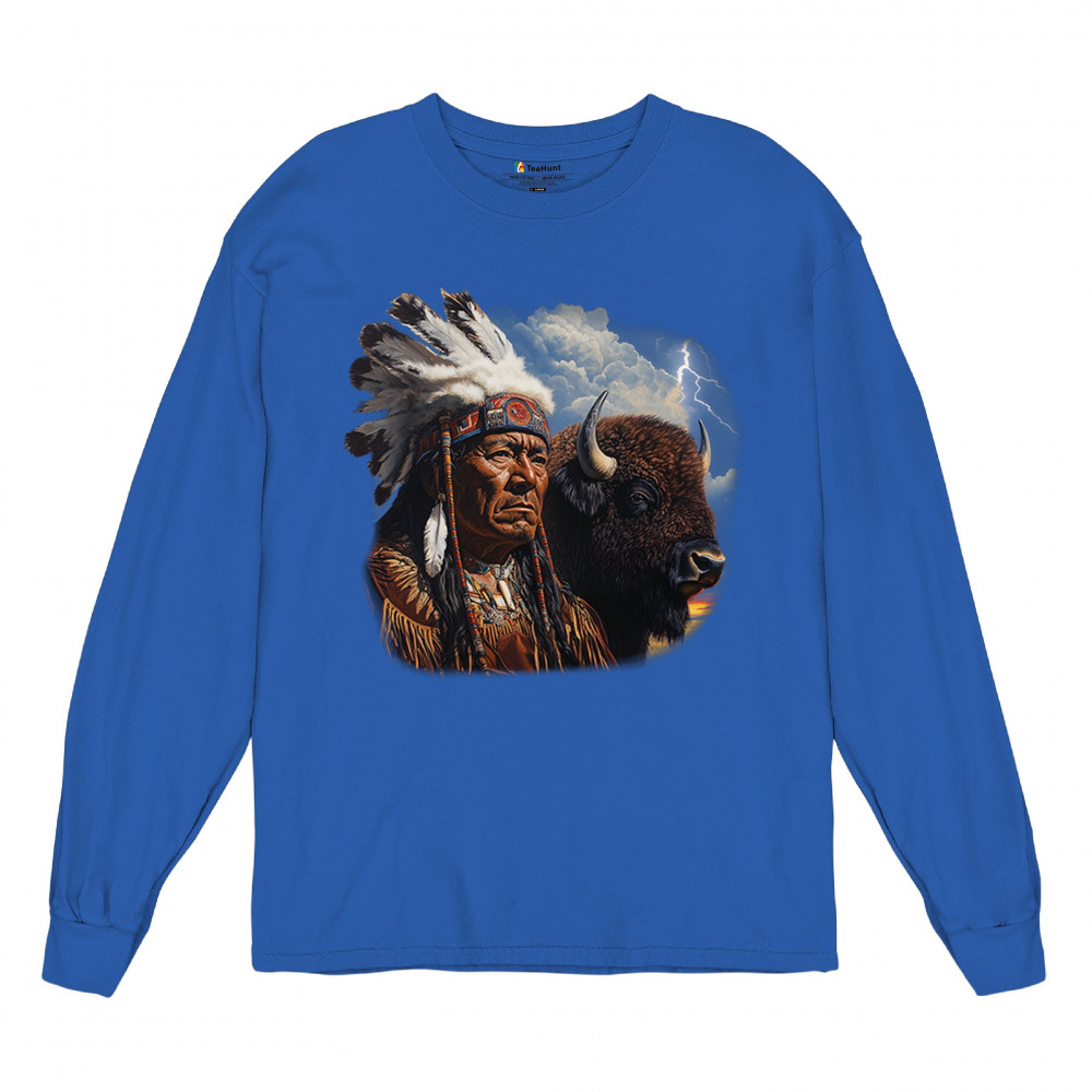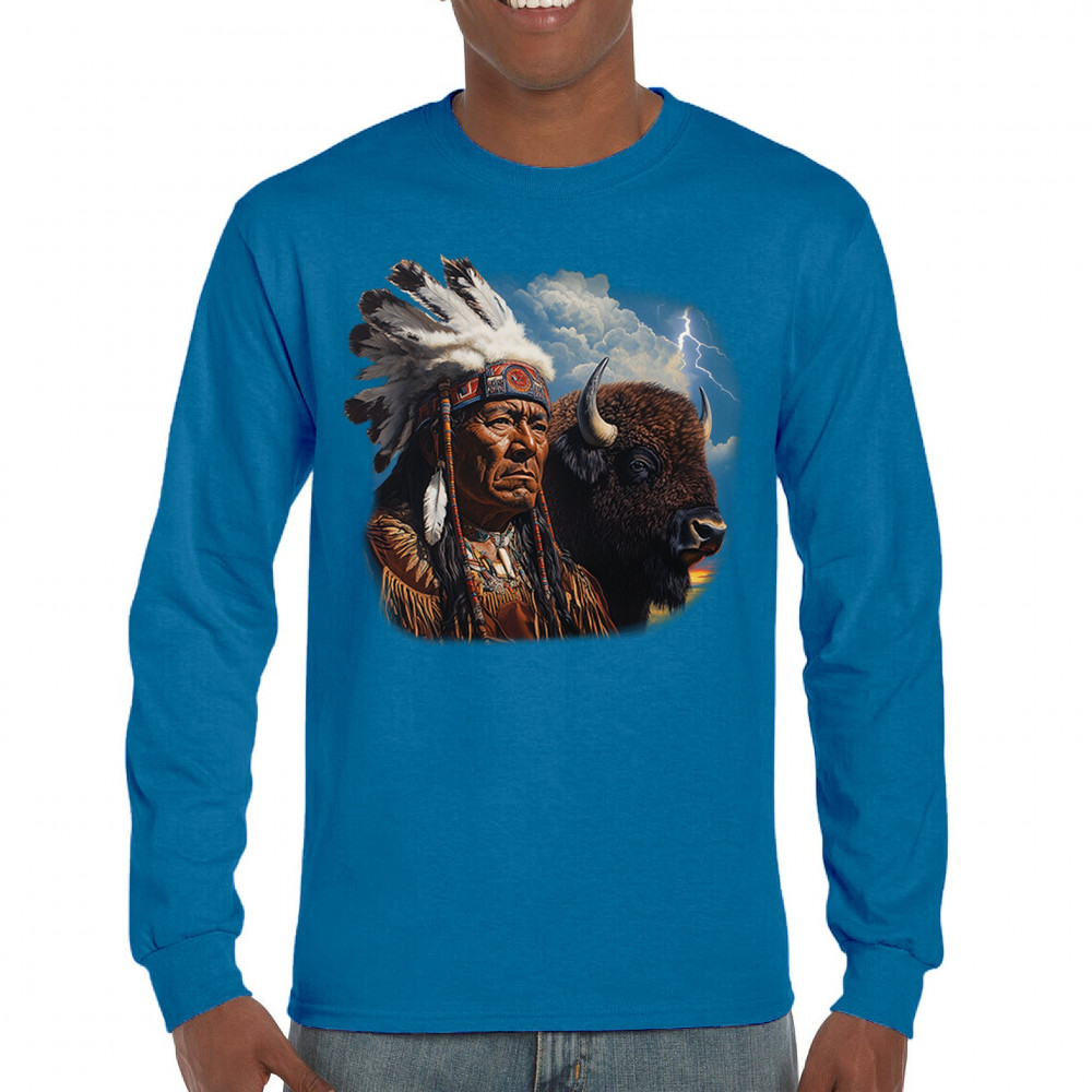 This powerful design features a Native American elder in traditional dress and feathered headdress beside a noble bison. Framed by a stormy sky and lightning, the art symbolizes tribal pride, spiritual harmony, ancestral strength, and a deep connection to nature’s raw energy.