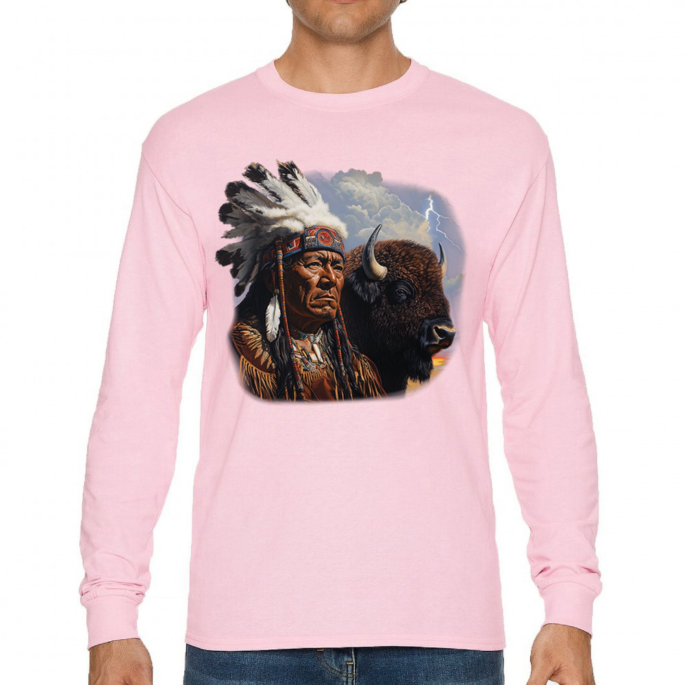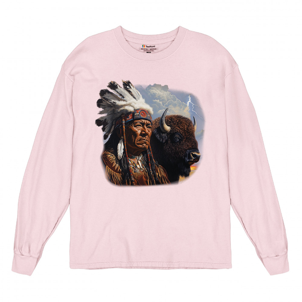 This powerful design features a Native American elder in traditional dress and feathered headdress beside a noble bison. Framed by a stormy sky and lightning, the art symbolizes tribal pride, spiritual harmony, ancestral strength, and a deep connection to nature’s raw energy.