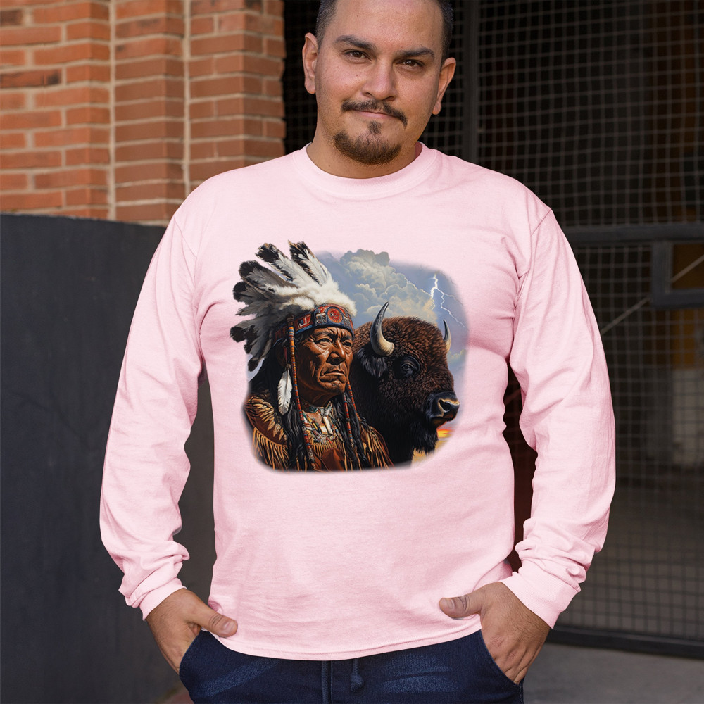 Bold tribal elder and bison design framed by lightning sky—honoring heritage, strength, resilience, and sacred connection to nature.