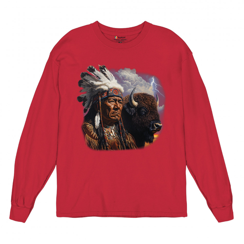 Bold tribal elder and bison design framed by lightning sky—honoring heritage, strength, resilience, and sacred connection to nature.