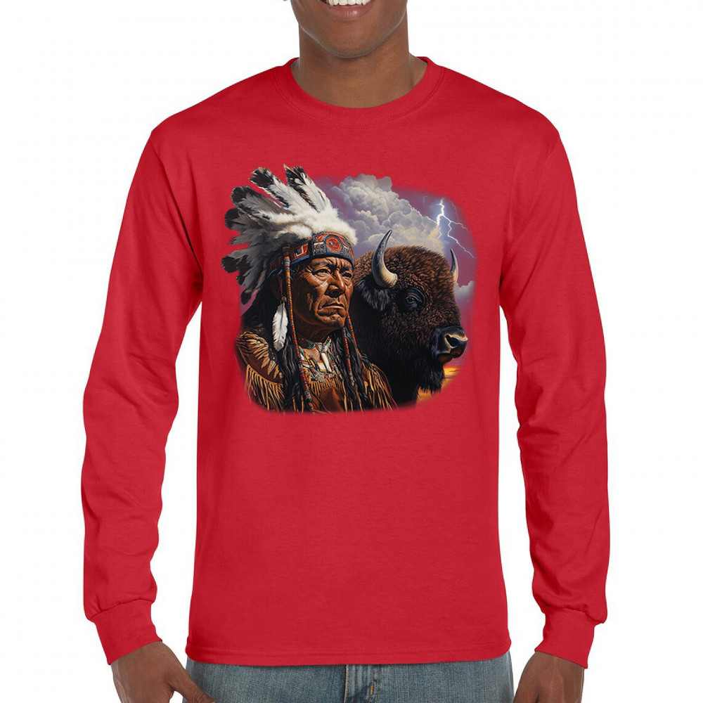 This powerful design features a Native American elder in traditional dress and feathered headdress beside a noble bison. Framed by a stormy sky and lightning, the art symbolizes tribal pride, spiritual harmony, ancestral strength, and a deep connection to nature’s raw energy.