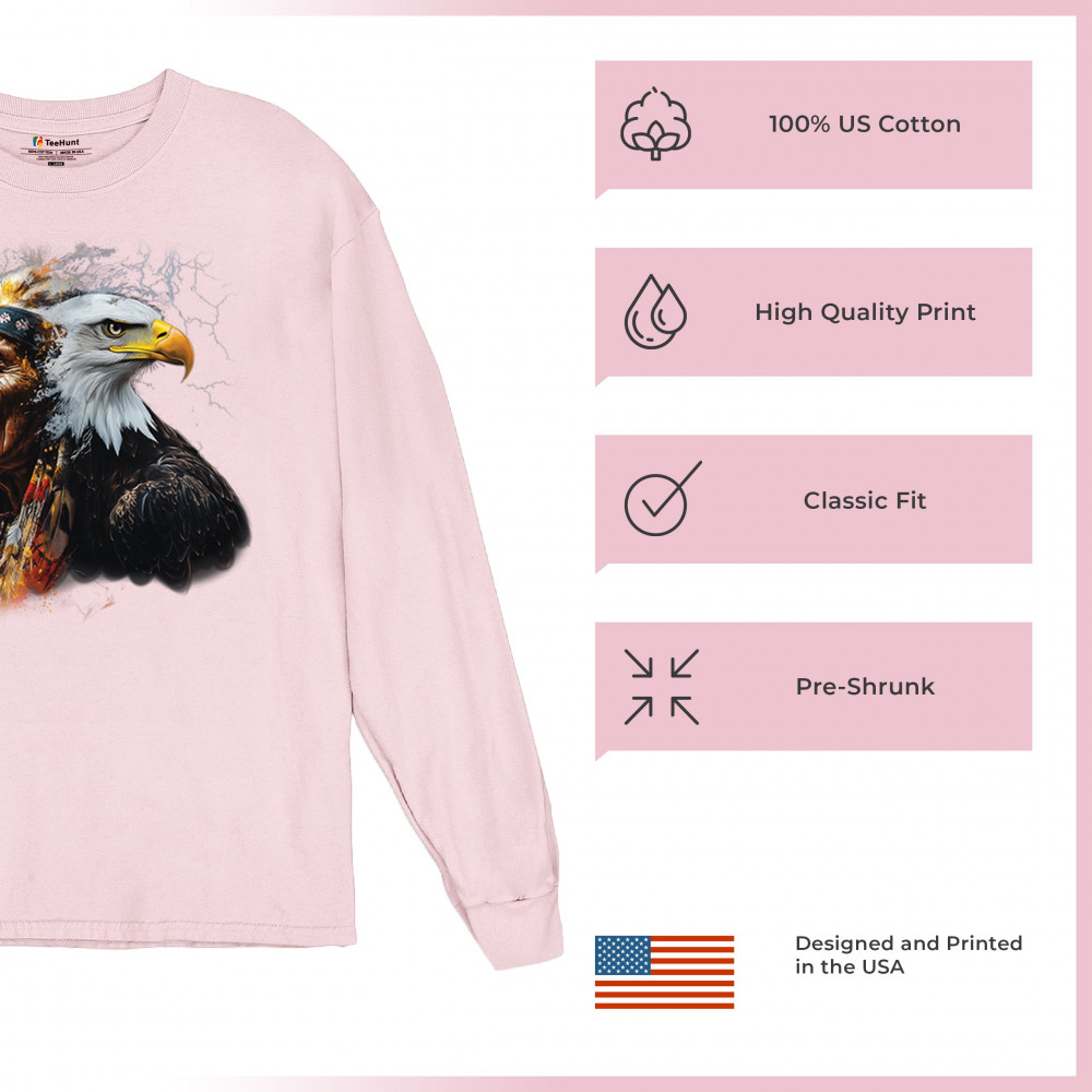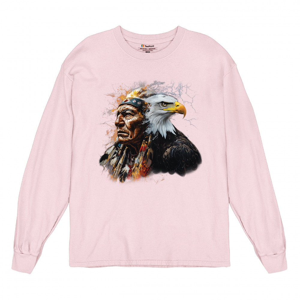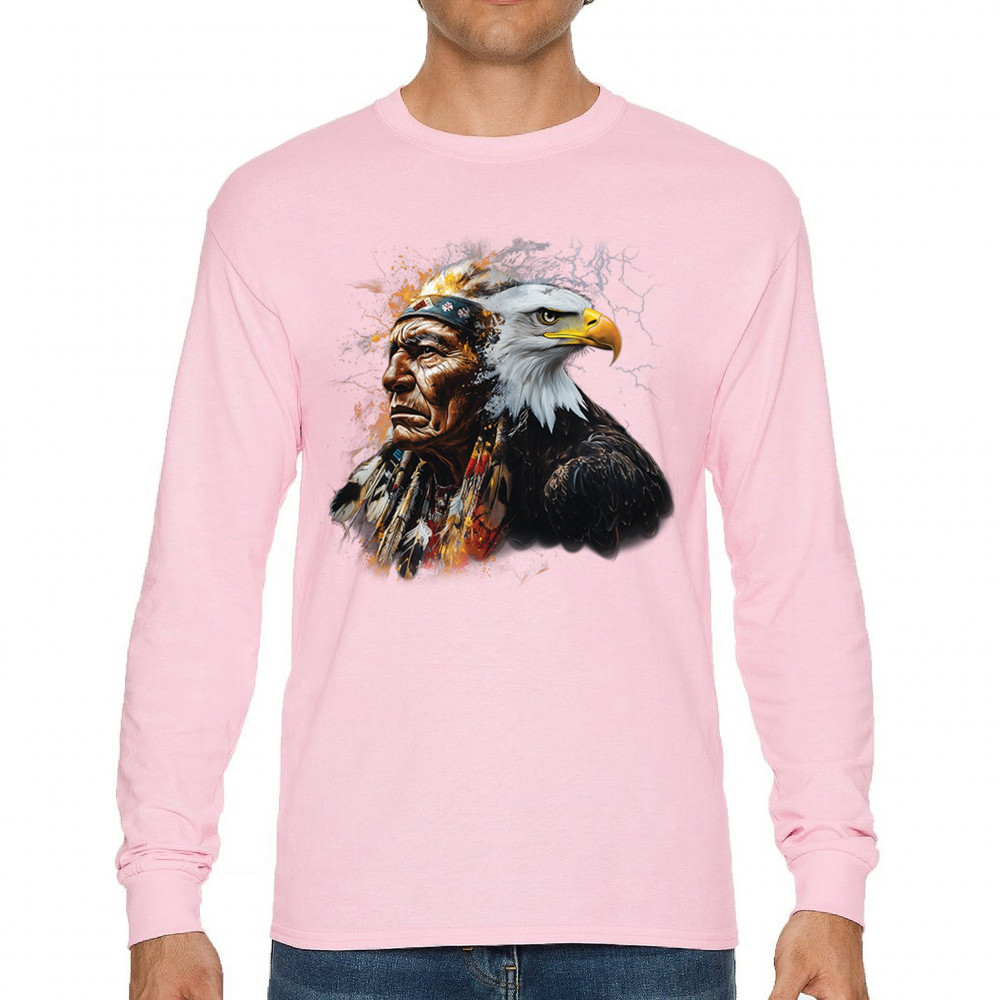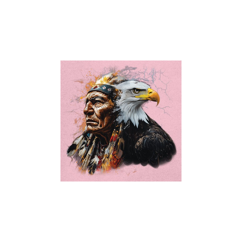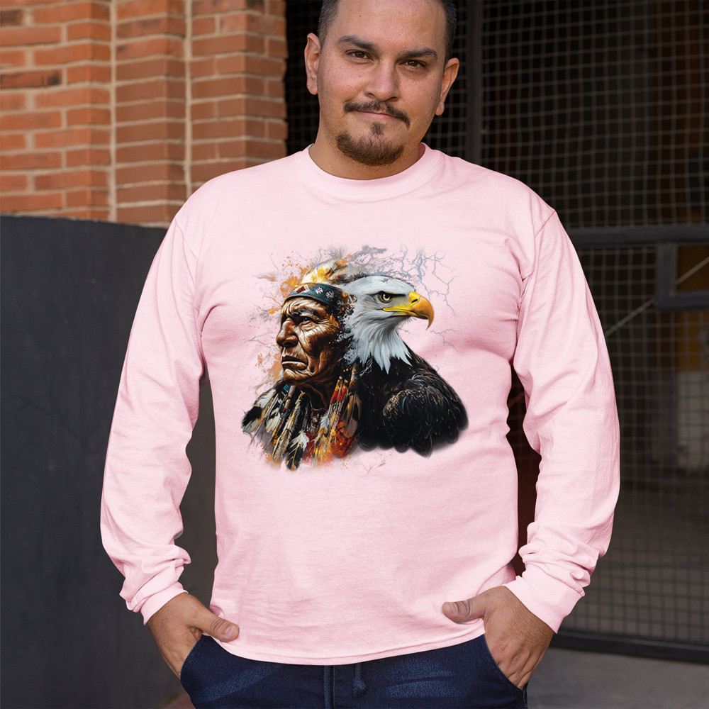 This electrifying design showcases a Native American chief with a bold bald eagle, surrounded by lightning and fire. It blends spiritual animal symbolism with cultural strength and pride. Ideal for admirers of tribal heritage, ancestral energy, and fierce visual storytelling through nature and tradition.
