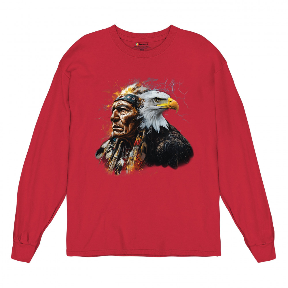 Bold tribal totem design with Native chief, eagle, lightning, and fire. A fierce blend of spirit, power, and cultural pride in one image.