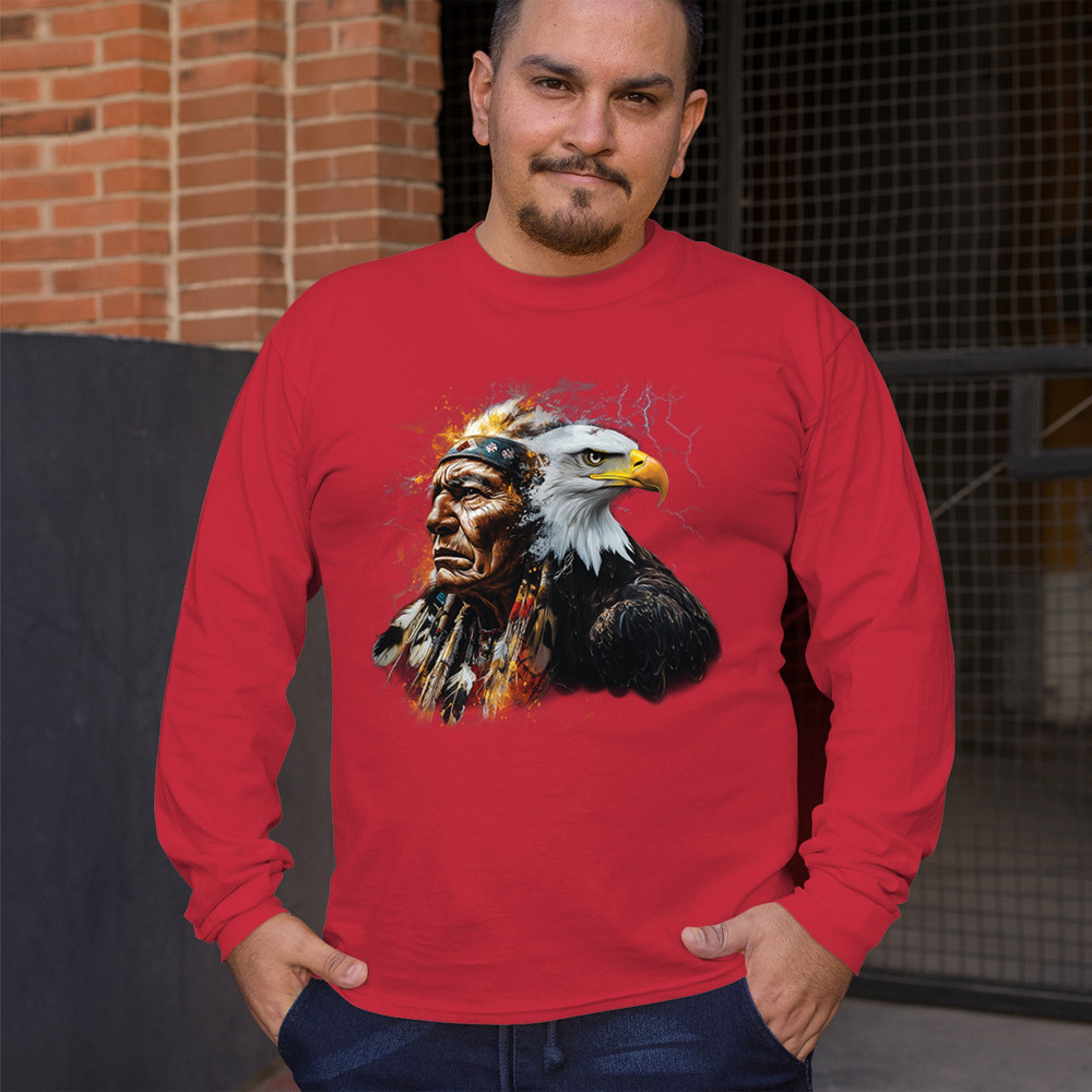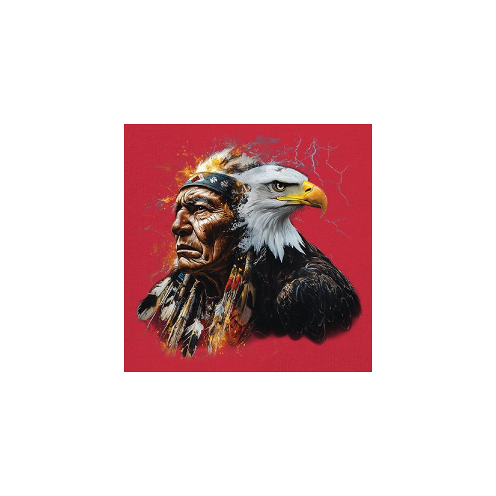 This electrifying design showcases a Native American chief with a bold bald eagle, surrounded by lightning and fire. It blends spiritual animal symbolism with cultural strength and pride. Ideal for admirers of tribal heritage, ancestral energy, and fierce visual storytelling through nature and tradition.