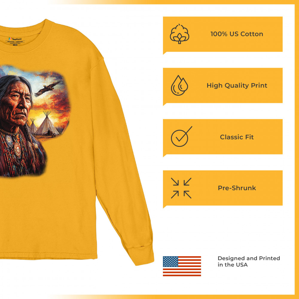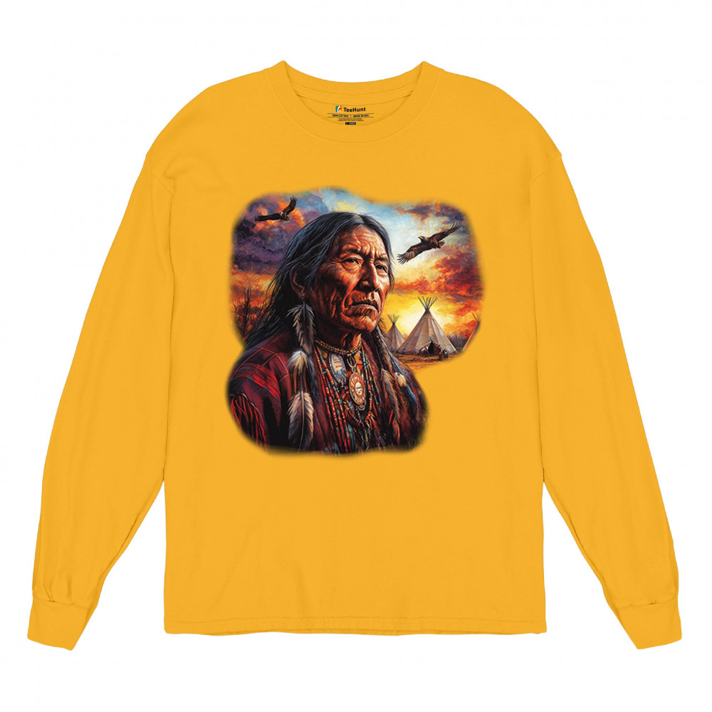 This vivid artwork features a Native American elder in traditional feathered attire, set before a blazing sunset with soaring eagles and peaceful teepees. The scene symbolizes strength, heritage, and spiritual wisdom. A heartfelt tribute to tribal pride, ancestral legacy, and cultural connection to land.